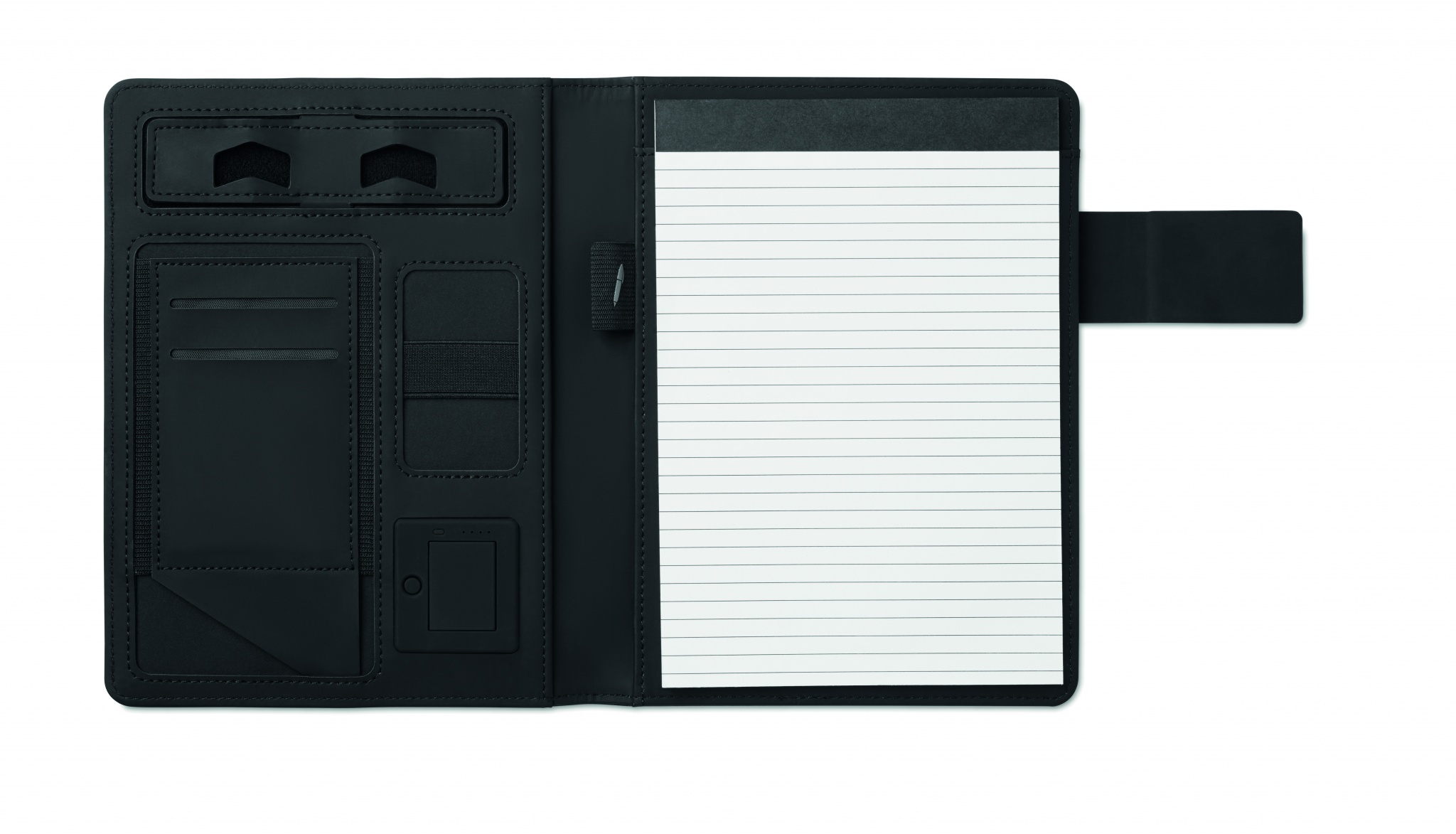 Pellava/PU A5 kokouskansio, jossa magneettisuljin. Sisäänrakennettu varavirtalähde 4000 mAh:n kapasiteetilla, joka riittää älypuhelimen lataamiseen 1-2 kertaa mallista riippuen. Sisäänrakennettu mikro-USB C- tyypin liitin. Sisältää matkapuhelintelineen, 20-sivuisen lehtiön ja useita pieniä taskuja helppoa säilytystä varten.