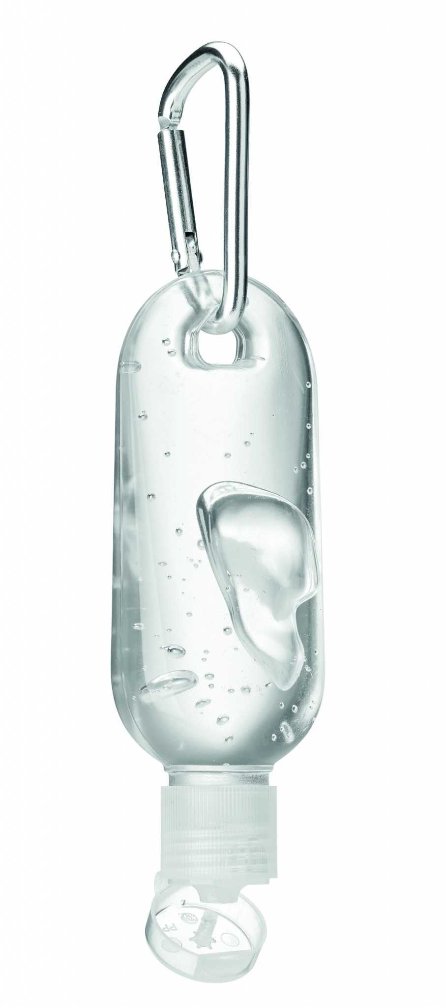 30 ml käsienpuhdistusgeeli PET pullossa, karabiinikoukulla. Karabiinikoukkua ei ole tarkoitettu kiipeilemiseen (ei ammattikäyttöön)