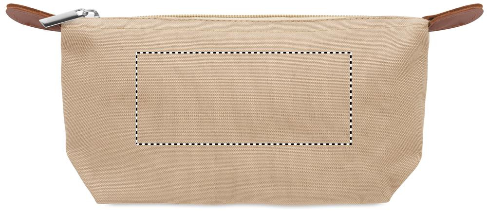 600D RPET-polyesteriä oleva kosmetiikkalaukku, jossa vetoketjukiinnitys ja ruskeat PU-yksityiskohdat.