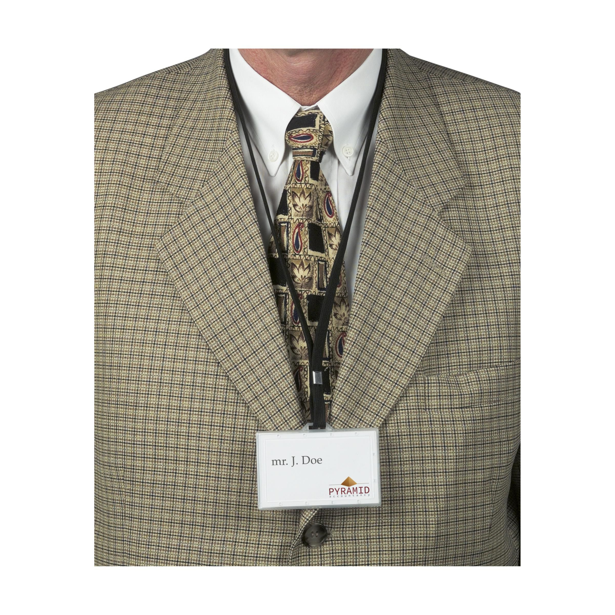 Läpinäkyvä nimikorttiteline kaulanauhalla (90 cm). Sisältää tyhjä korttipaikka.