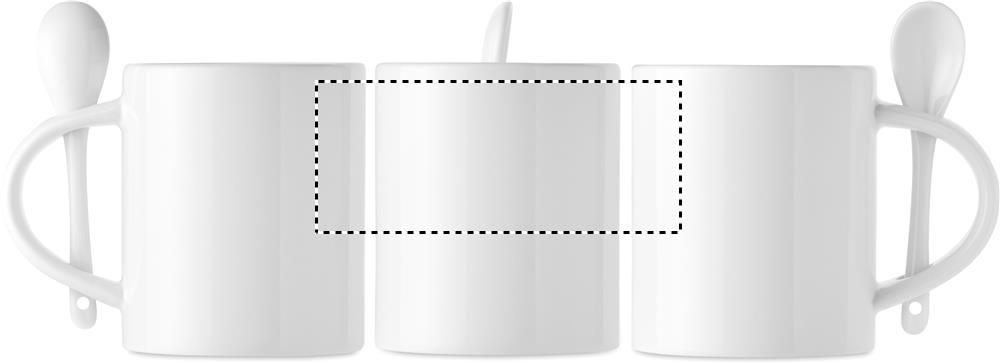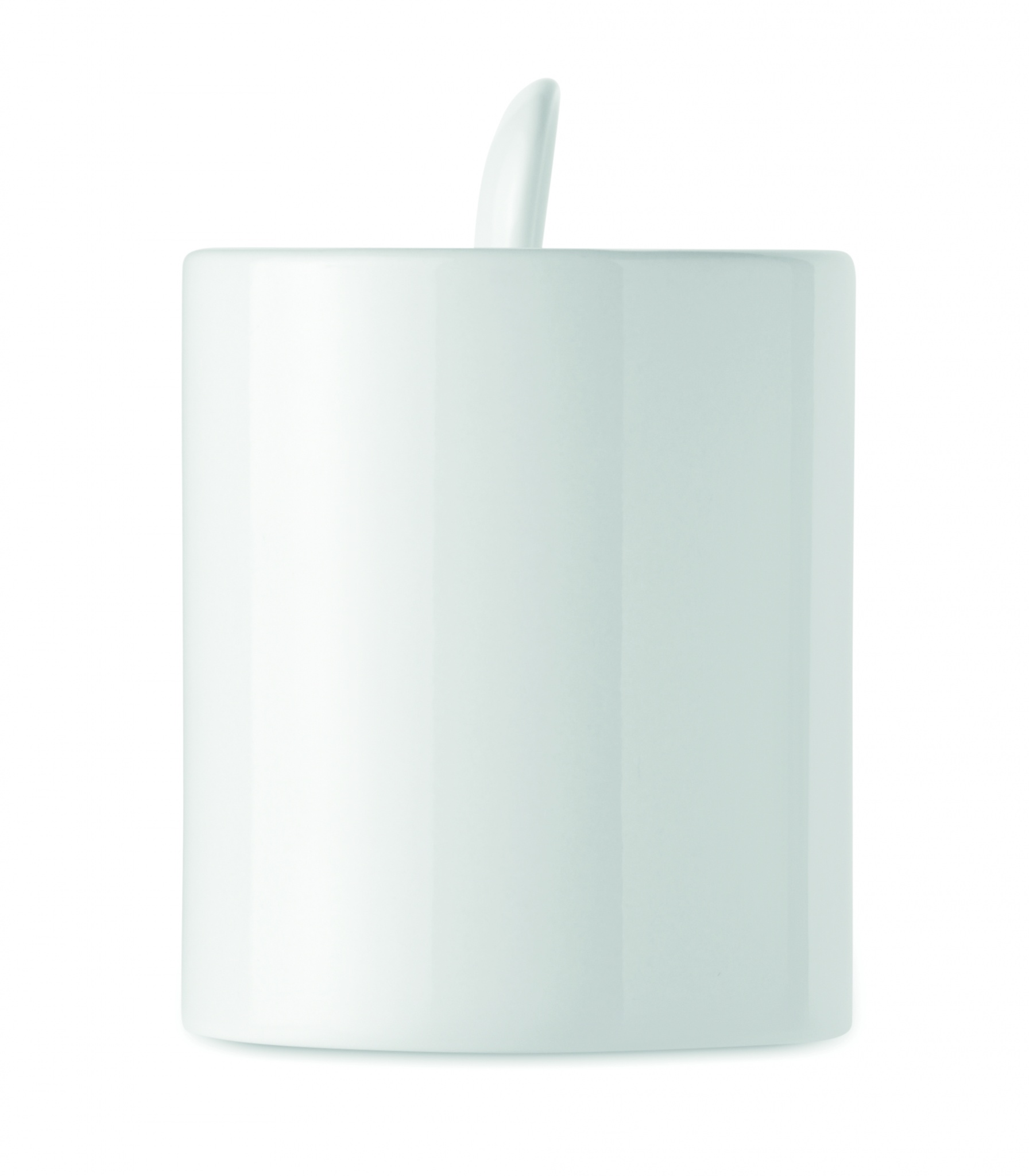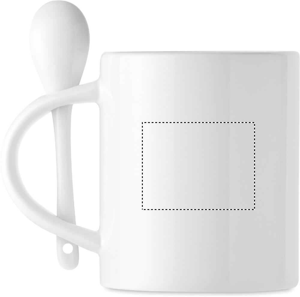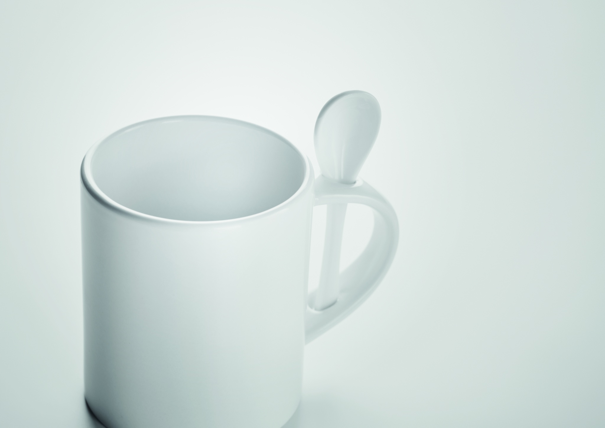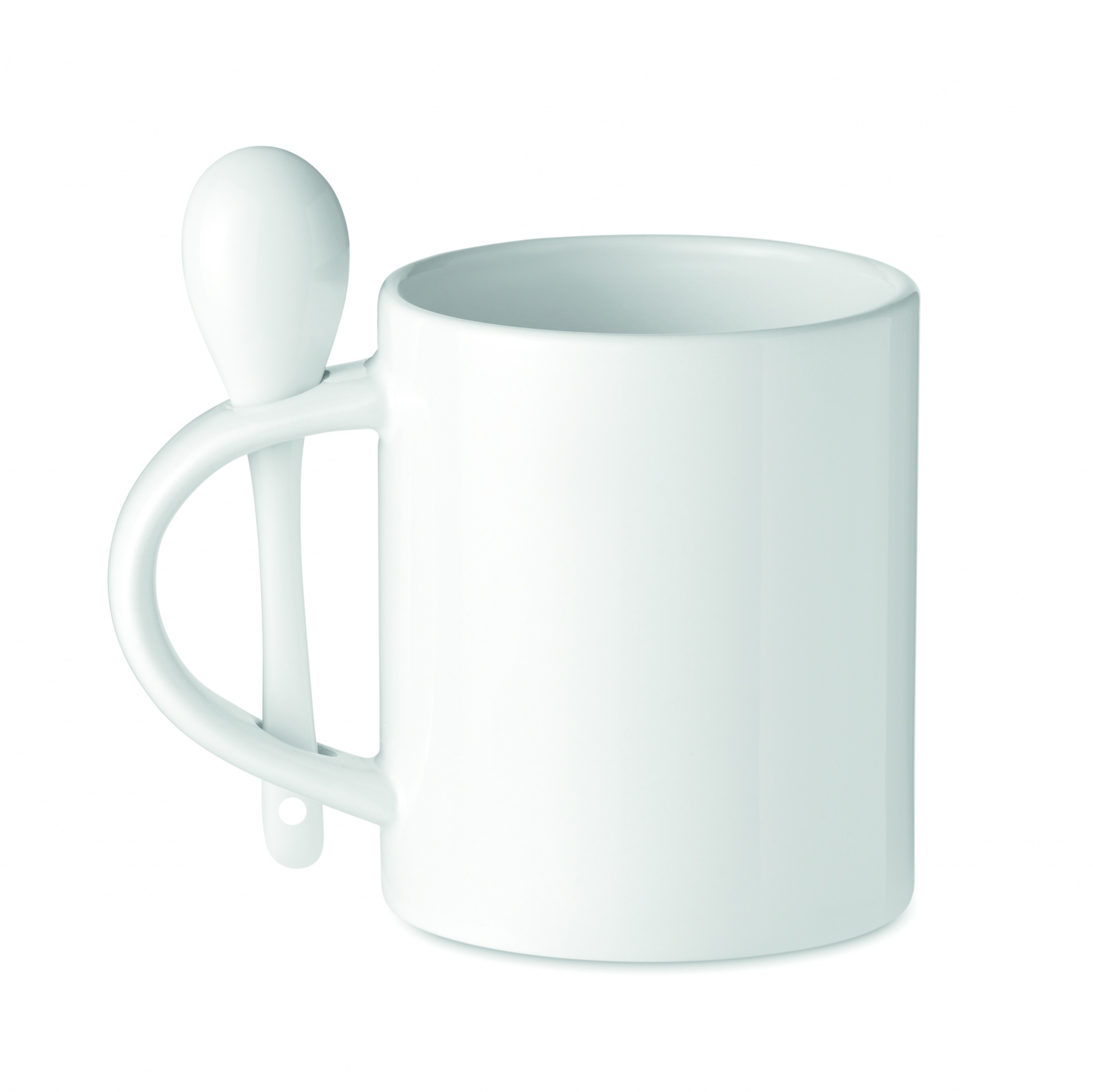 Keraaminen 300 ml muki lusikalla ja erikoispinnoite sublimaatio painatukseen.