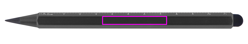 Alumiininen musteton kynä, jossa on kosketustoiminto ja asteikko cm ja tuuma. Lyijy on valmistettu grafiitin ja metallin sekoituksesta, mikä tekee siitä erittäin kestävän. Logosi kaiverretaan piipun vapaaseen tilaan.