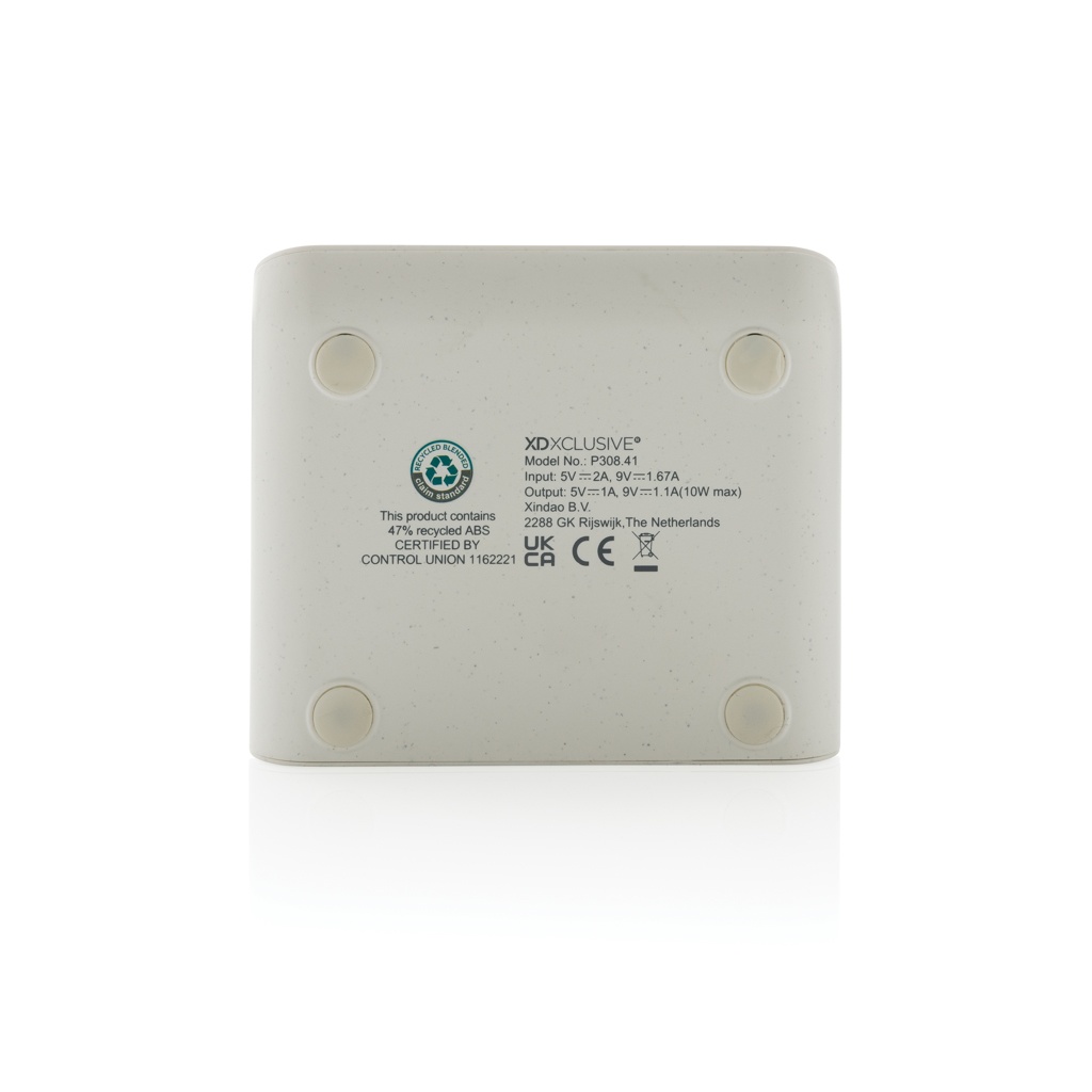 10W langaton pikalaturi valmistettuna RCS (Recycled Claim Standard) sertifioidusta kierrätetystä ABS:stä. Kierrätetyn materiaalin kokonaismäärä: 47% perustuen tuotteen kokonaispainoon. RCS sertifiointi varmistaa kierrätettyjen materiaalien täysin sertifioidun toimitusketjun. Langaton latausalue valmistettu FSC 100 bambusta. Takaosassa kaksi USB porttia langallista latausta varten. Pidike on suunniteltu siten, että voit ladata puhelintasi vaaka- tai pystysuorassa. Sopii siis hyvin videoiden katseluun ladattaessa. Langaton lataus yhteensopiva Androidin uusimpien sukupolvien sekä iPhone 8 ja uudempien kanssa. Tuote ja lisätarvikkeet PVC-vapaita. Sisältää 120 cm tyypin C latauskaapelin valmistettuna RCS sertifioidusta kierrätetystä TPE:stä. Pakattu FSC-sekoituksesta valmistettuun kraft pakkaukseen. Tyypin C tulovirta 5V/2A; 9V/2A; langaton lähtövirta 5V/1A;9V/1.1A; (10W). Rekisteröity design®