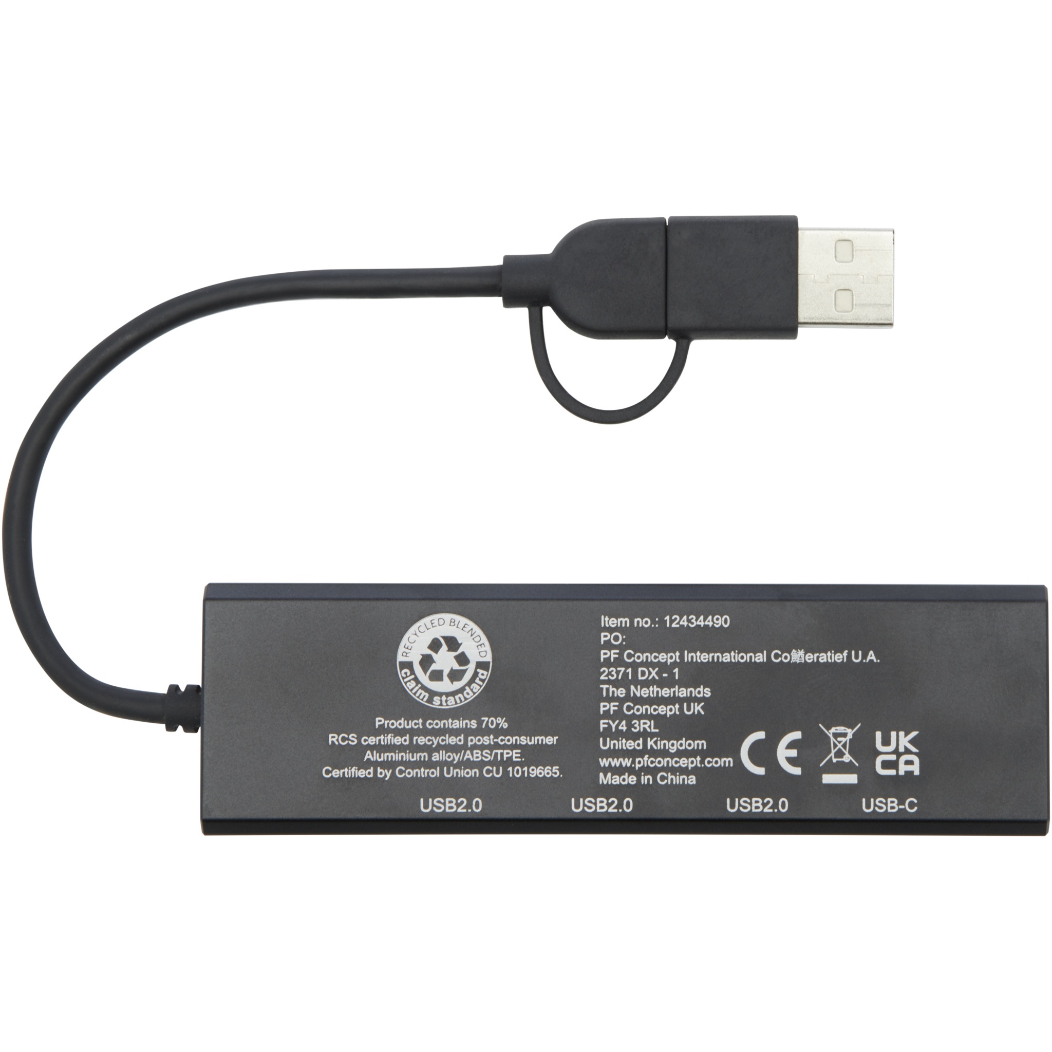 RCS-kierrätetystä alumiinista valmistettu USB 2.0 -keskitin, jossa on tyylikäs suorakaiteen muotoinen kierrätysalumiininen kotelo. Keskittimessä on 3 x USB 2.0 -porttia ja 1 x Type-C PD (Power Delivery) -portti, jonka avulla voit siirtää tietoja jopa 480 Mbps:n siirtonopeudella. Mukana toimitetun Type-C-tulosovittimen avulla voit käyttää tätä laitetta sekä USB-A- että Type-C-yhteensopivien kannettavien tietokoneiden ja pöytätietokoneiden kanssa. Toimitetaan 100-prosenttisesti kierrätetyssä voimapaperipakkauksessa, jossa on värikäs tarra.