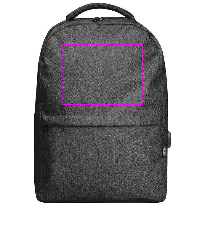 rPET-reppu, jossa USB-portti, pehmustetut olkaimet, lokero kannettavalle tietokoneelle, etutasku ja varkaudenestoosasto. Painamme logosi etuosastoon.