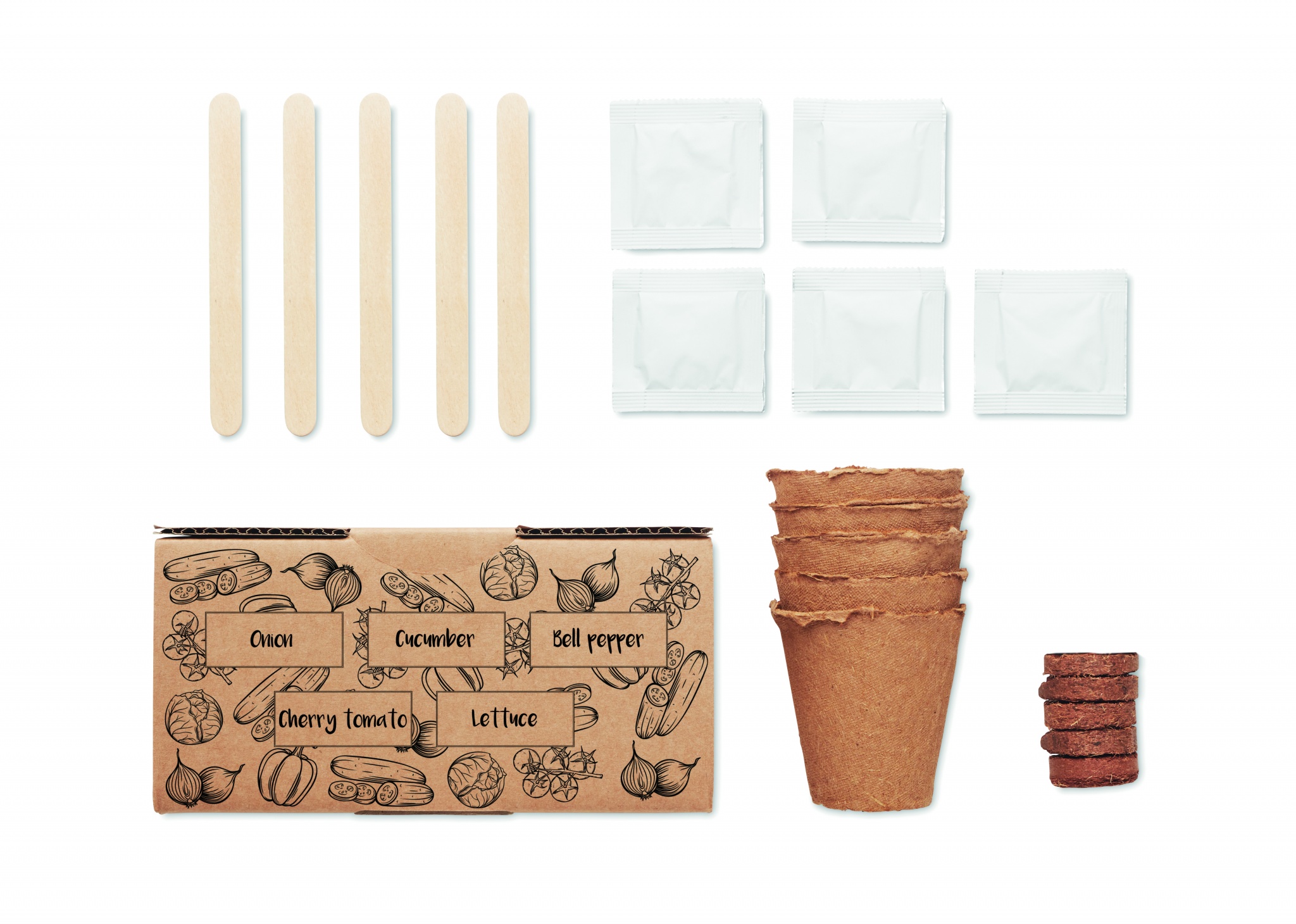 Salaatin kasvatus sarja, sisältää sipulin, kurkun, paprikan, tomaatin ja lehtisalaatin siemeniä. Eurooppa tuotantoa. Sisältää turvenapin.