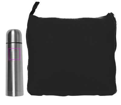 Täydellinen kaksikko! Asiakkaasi saavat kaiken tarvitsemansa pehmoiseen iltaan tai matkaan tämän mukavan setin avulla. Saat mukavan 2-in-1-fleece-peiton (180 x 120 cm), joka voidaan muuntaa tyynyksi kiinnitetyn vetoketjun ja 500 ml:n lämpöpullon avulla. Kaivertamme logosi pulloon tai brodeeraamalla peittoon. Yksittäin pakattu laatikkoon.