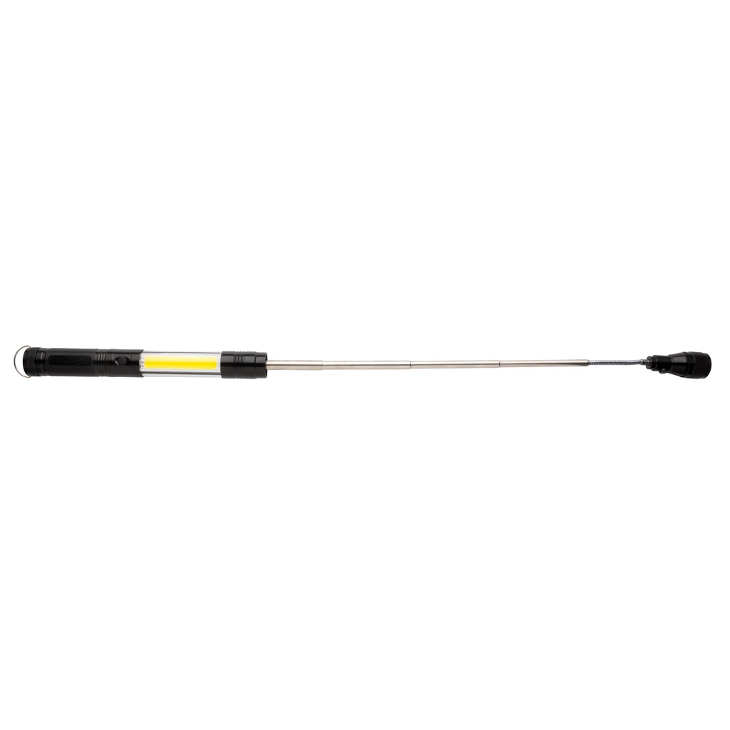 Täydellinen työvalo mihin tahansa tarpeeseen. Tämä kaksinkertainen magneettinen LED-työvalo sopii erinomaisesti kiinnittämiseen mihin tahansa metallipintaan optimaaliseen valaistukseen. Tämän alumiini taskulampun voi pidentää normaalista koostaan ​​26 cm:stä 64 cm:n. Voit täten poimia esineitä, jotka ovat kiinni vaikeasti näkyvissä ja tavoitettavissa paikoissa magneetin ollessa edessä. Taskulamppu on varustettu kolmella 10 l LED:llä erityisen kirkkaalle valaistukselle pimeissä tiloissa ja 80 lumenin COB-valolla. Kun taskulampun päätä jatketaan, pää muuttuu joustavaksi ja sitä voidaan säätää mihin tahansa suuntaan. Sisältää paristot välittömään käyttöön.