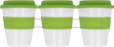 Yksiseinäinen 350 ml PP muki silikonikannella ja -vyötteellä, tuote saattaa kuumentua ulkoisesti käytössä.