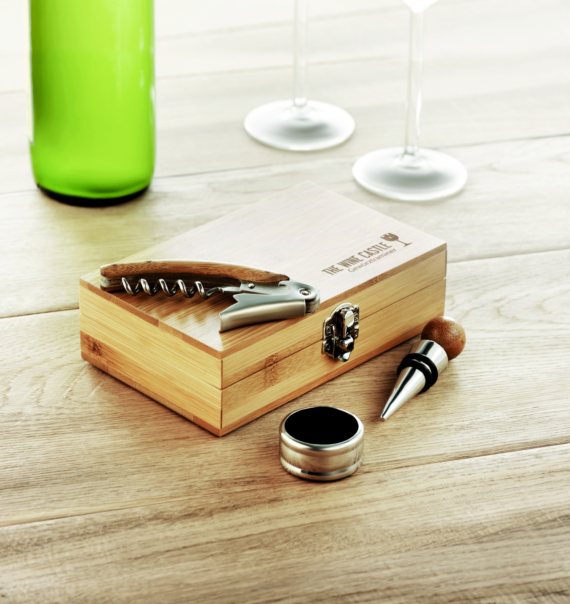 Viinisetti bambupakkauksessa sisältää korkkiruuvin, viinikauluksen ja viinikorkin, ruostumattomasta teräksestä ja bambusta. Bambu on luonnollinen materiaali, tuotteen värissä ja koossa voi olla pieniä eroja, saattaa vaikuttaa personalisoinnin lopputulokseen.