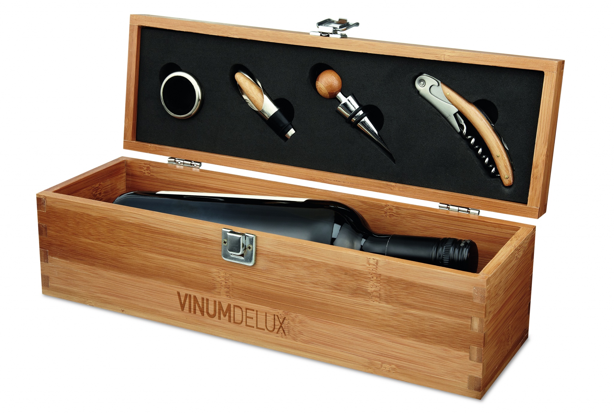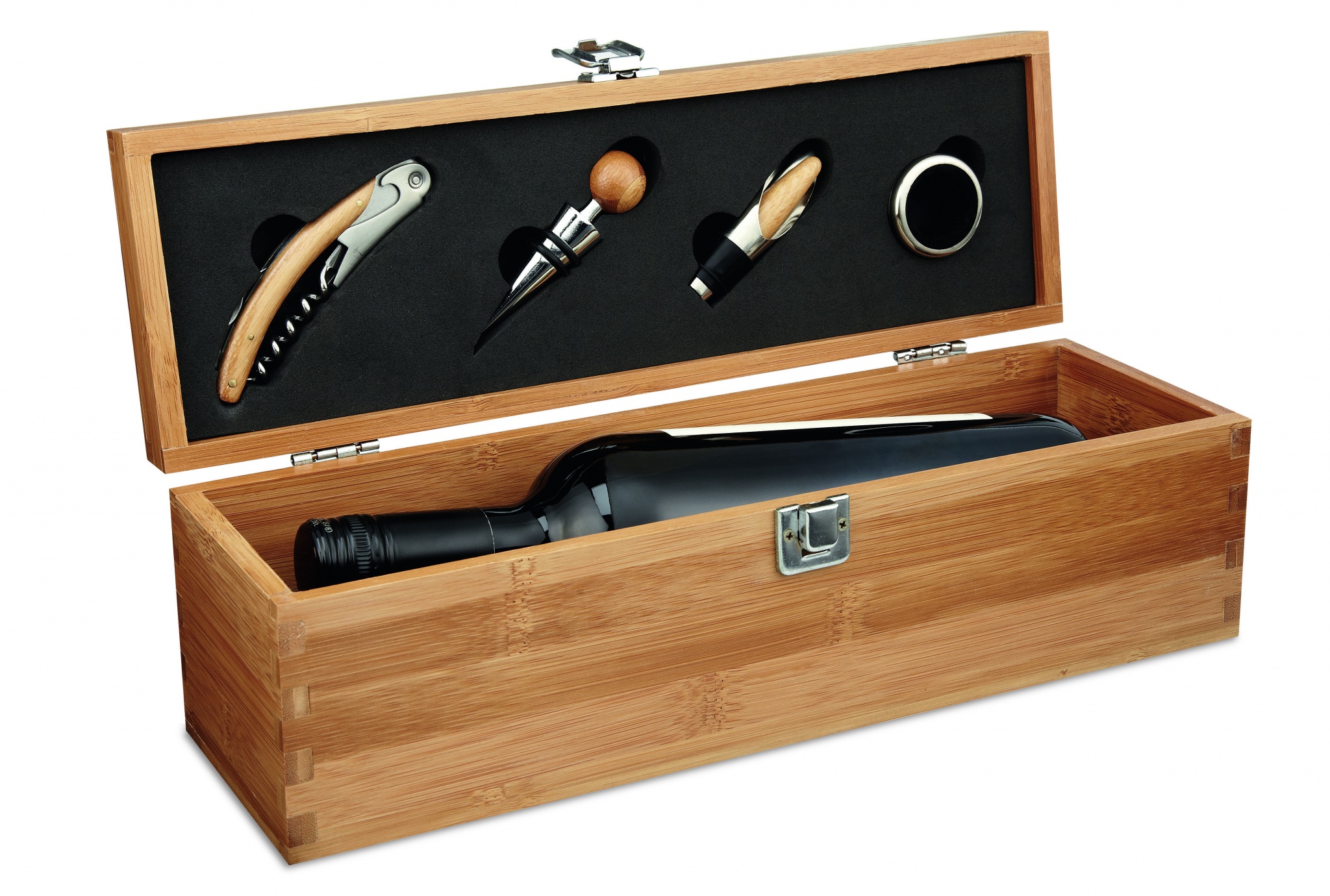 Viinisetti bambulaatikossa, tilaa yhdelle viinipullolle. Sisältää pullonkauluksen, viininkaatimen, tulpan ja korkkiruuvin. Viinipullo ei sisälly hintaan, bambu on luonnollinen materiaali, jolloin tuotteen väri voi vaihdella.