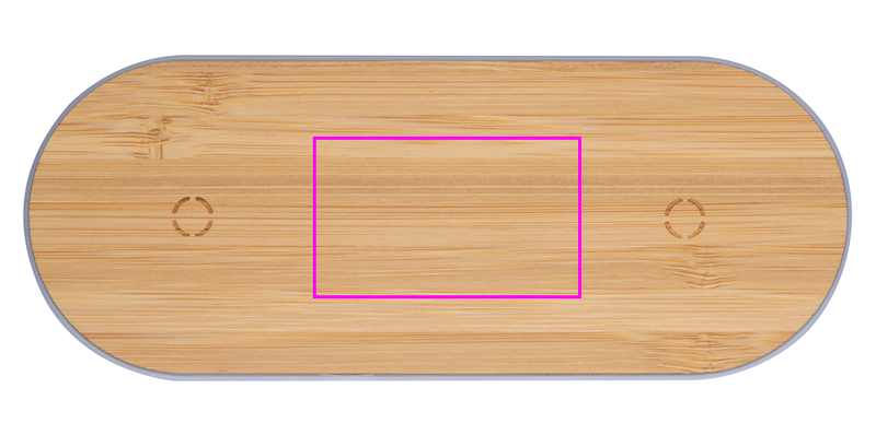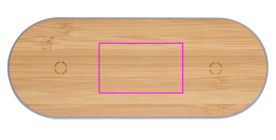 Plāna plastmasas uzlādes stacija ar bambusa virsmu un diviem indukcijas uzlādes punktiem viedtālruņiem, ieskaitot uzlādes kabeli. Jūsu logotips tiks iegravēts uz stacijas.