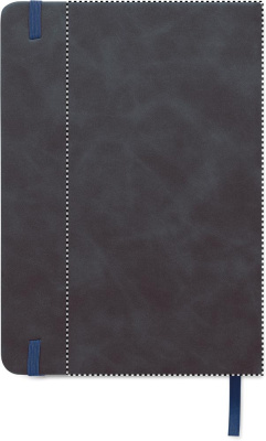 A5 notebook in 40% recycled post consumer smokey hard PU cover and 60% PU cover. Casebound. 160 lined pages, 70gsm recycled paper (80 sheets). Matching elastic closure strap and ribbon page marker.