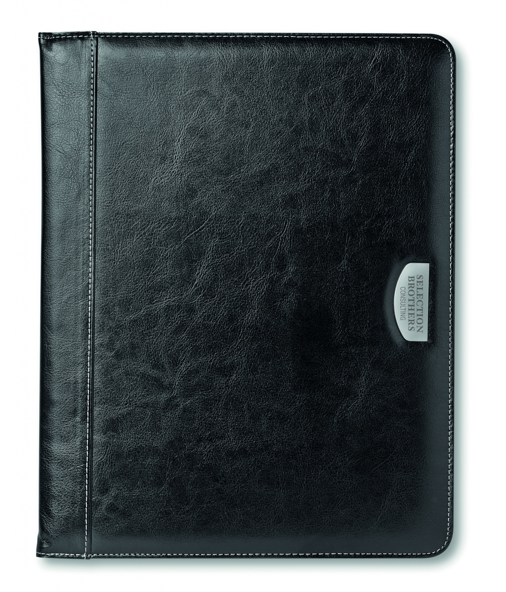 Папка для бумаг формата А4 с металлической пластинкой для логотипа. Включает блокнот на 20 листов