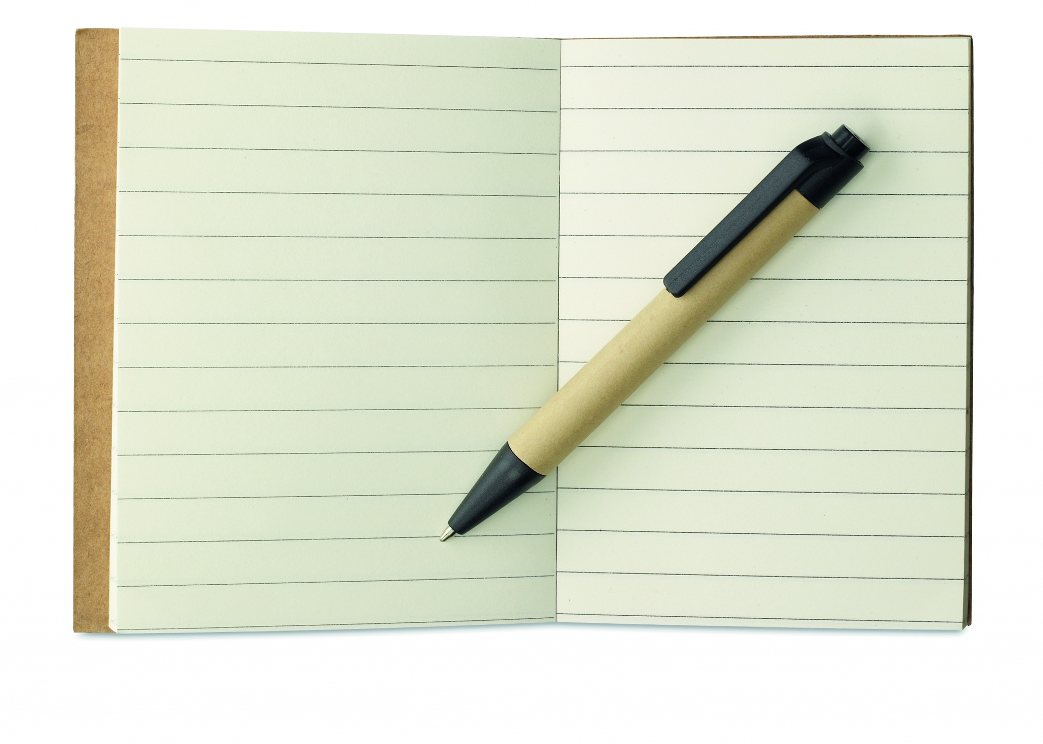 Блокнот для заметок на 80 листов и мини-ручка из биоперерабатываемого материала с синими чернилами.