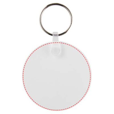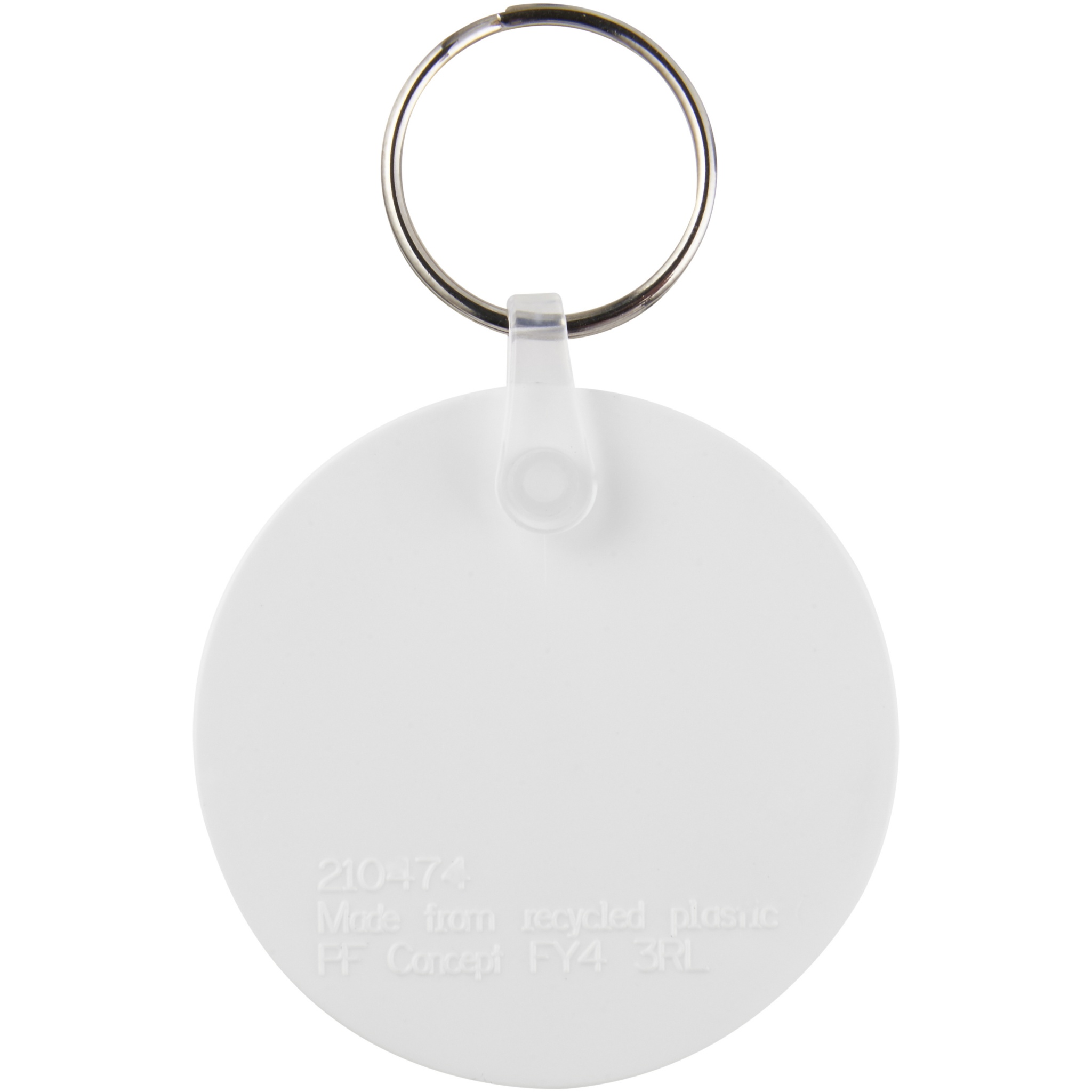 Брелок белого цвета круглой формы с металлическим разъемным кольцом для ключей. Металлическая петля для крепления кольца представляет собой плоский профиль, что делает его идеальным для пересылки.