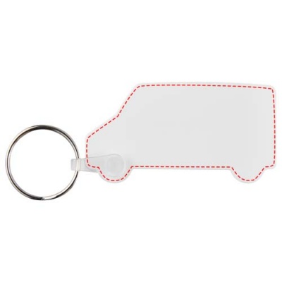 Брелок белого цвета в форме фургона с металлическим разъемным кольцом для ключей. Металлическая петля для крепления кольца представляет собой плоский профиль, что делает его идеальным для пересылки.