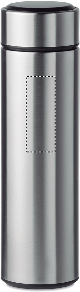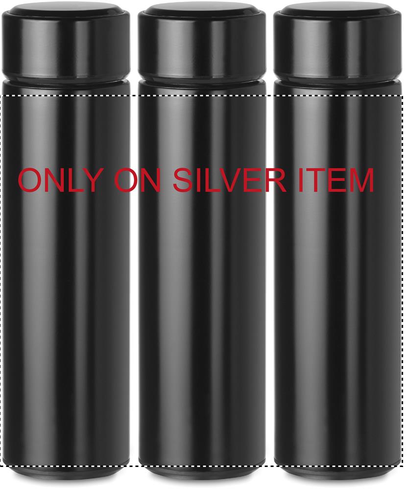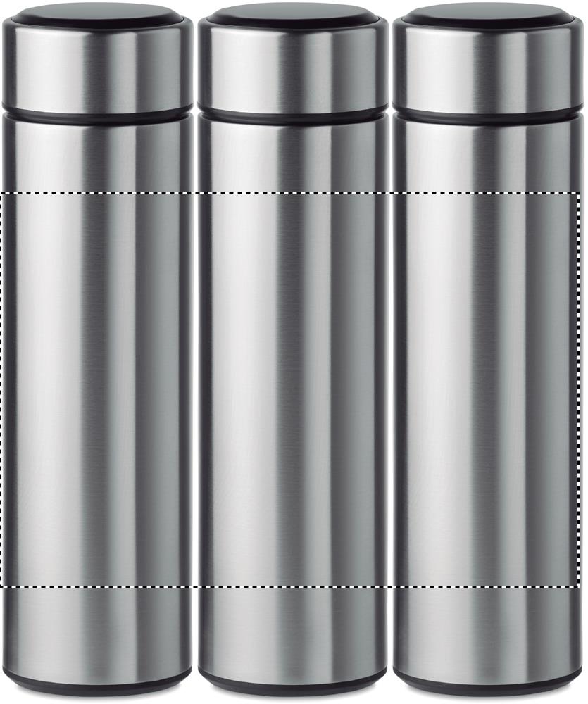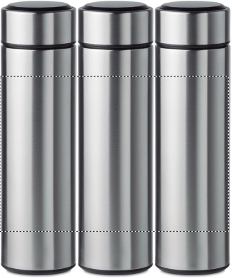 Бутылка вакуумная двустенчатая из нержавеющей стали. Имеет встроенный сенсорный светодиодный термометр на крышке и внутри чайное ситечко. Батарейка тип CR2032 в комплекте. Не протекает.Объем 450 мл. Не протекает.
