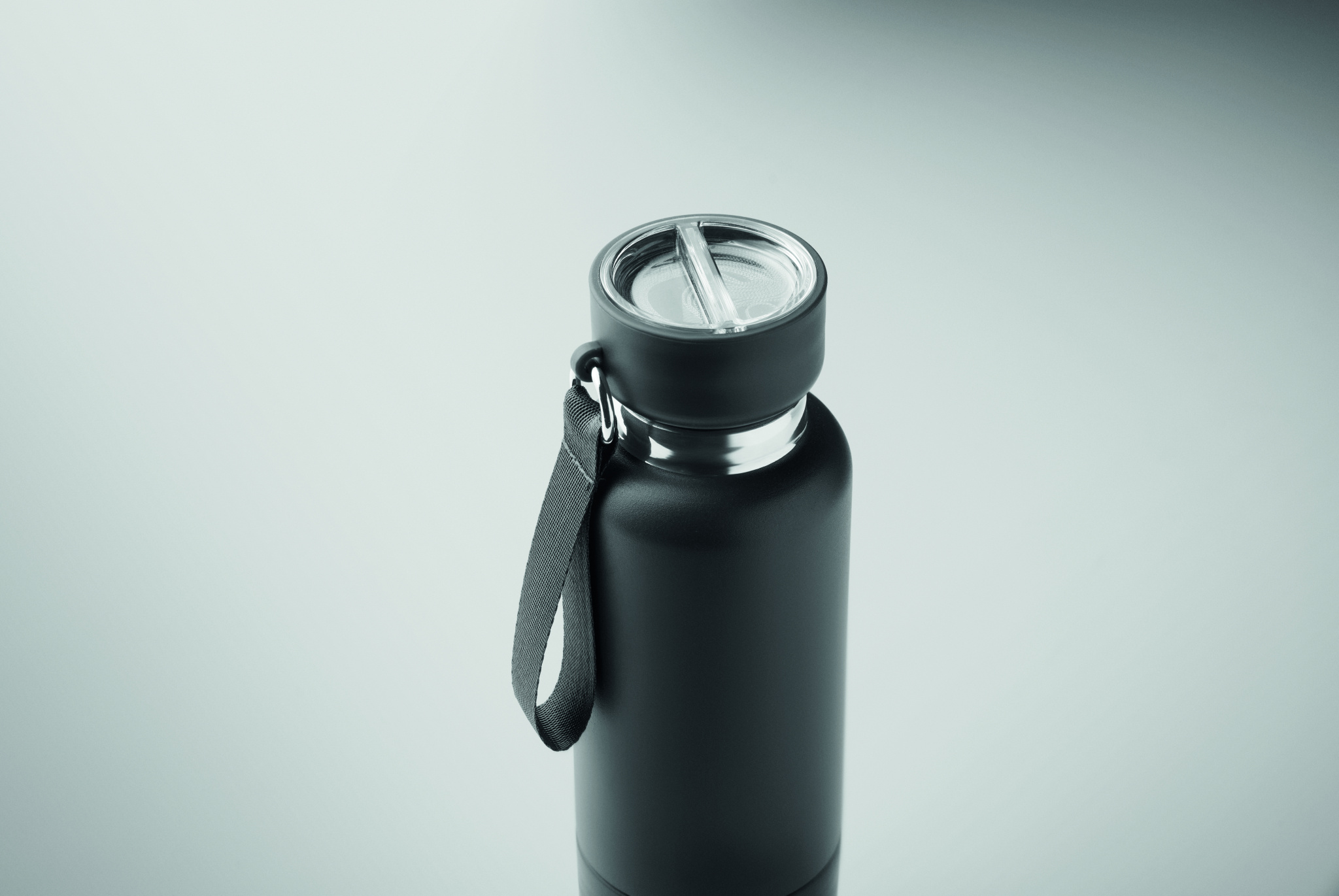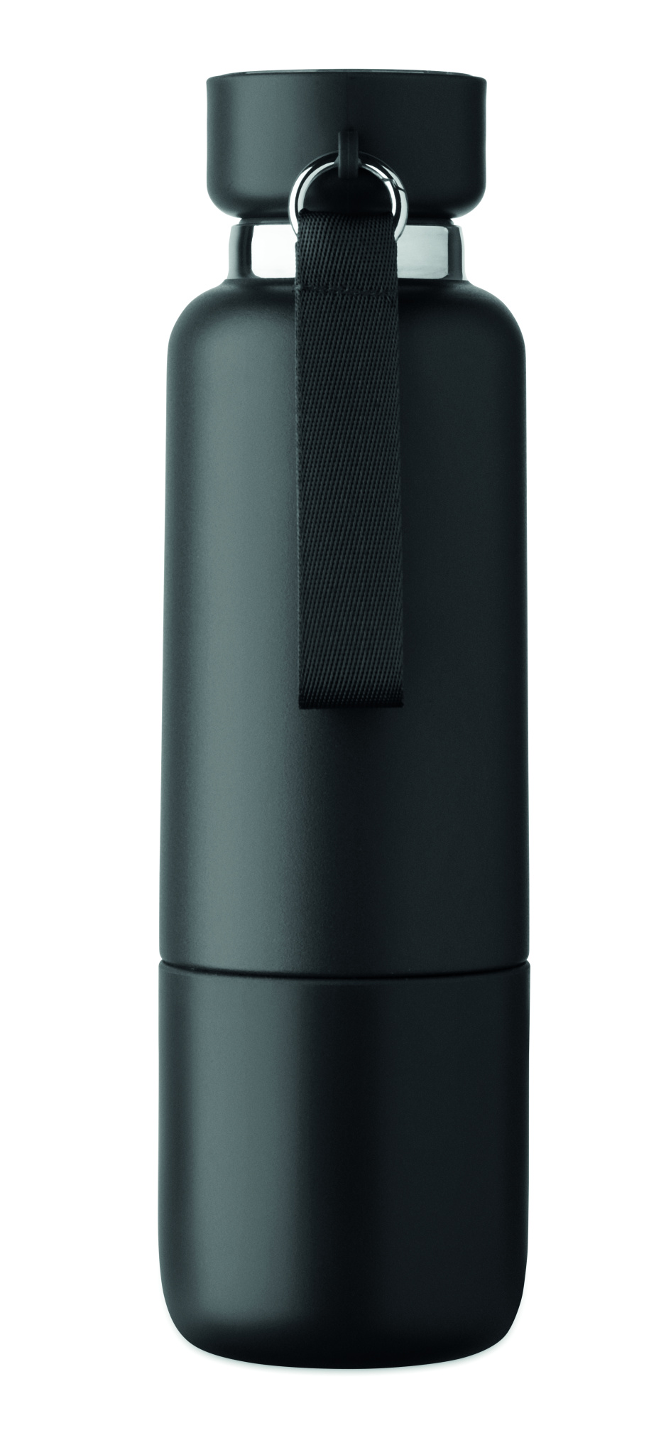 Double wall insulated bottle in 90% recycled stainless steel and 10% stainless steel, with integrated strap handle and additional long strap (70cm) in PP lid. Leak-free. Bottom cup included. Capacity: 500 ml.