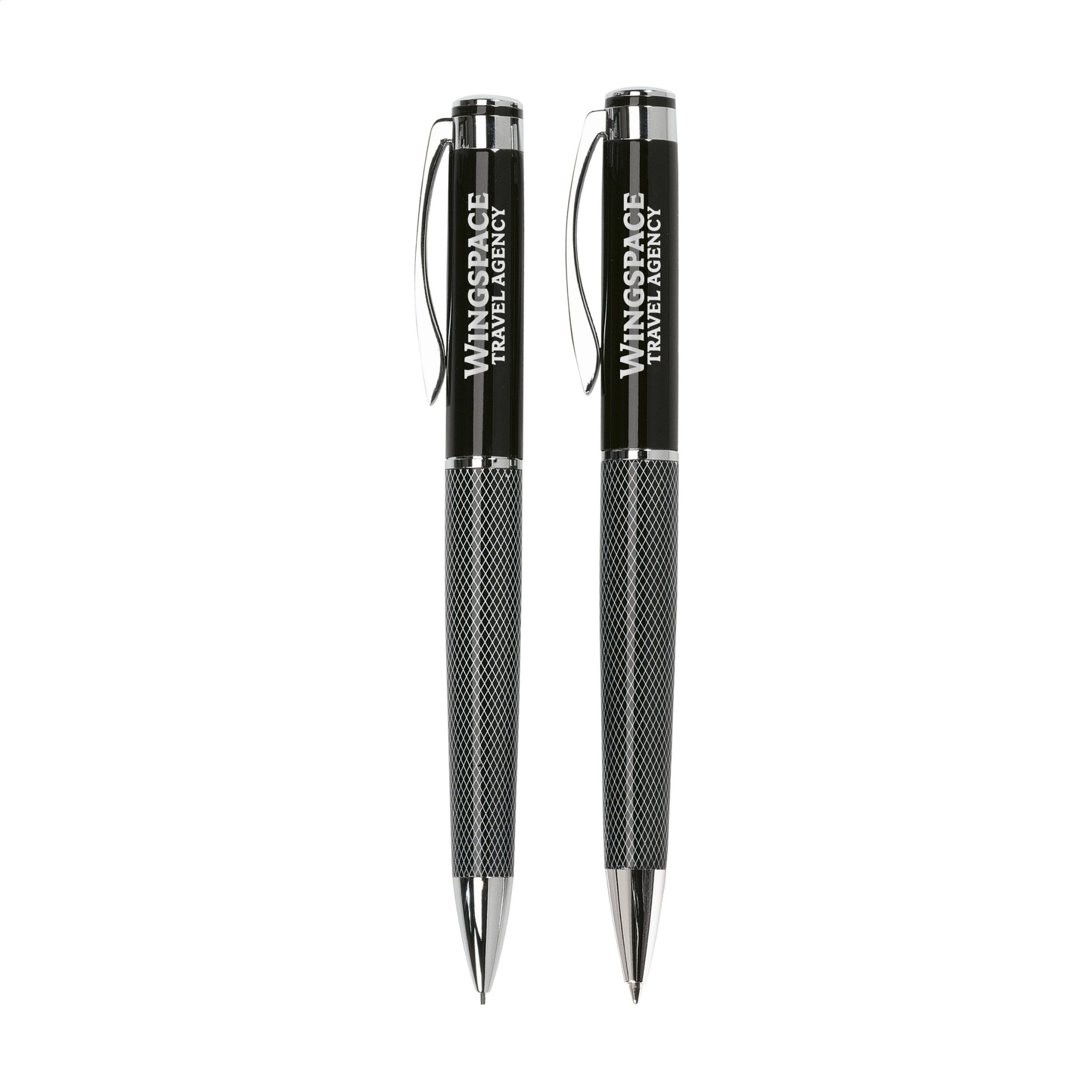 Письменный набор: шариковая ручка с синими чернилами и поворотным наконечником и заправляемый карандаш с 3 стержнями HB (0,9 мм). Оба с металлической отделкой. В футляре.
