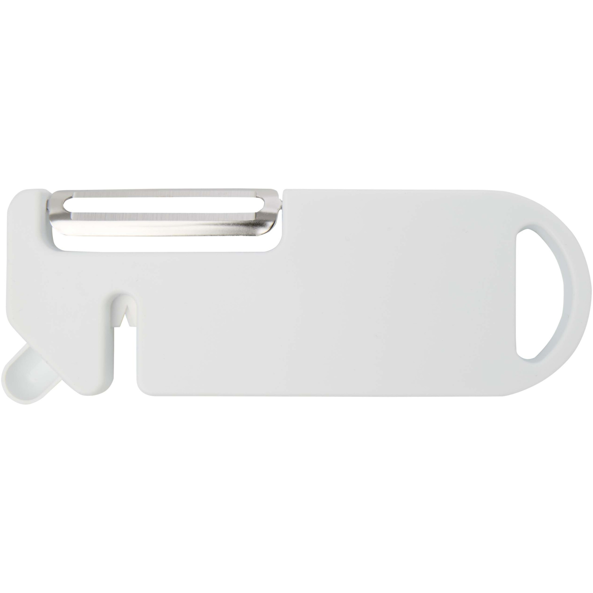 Этот многофункциональный кухонный инструмент объединяет четыре основные функции в одном компактном корпусе. Изготовленный из переработанной пластмассы, он оснащен овощечисткой, открывалкой для бутылок, точилкой для ножей и заостренным наконечником для удаления пятен с картофеля. Встроенное отверстие для подвешивания обеспечивает удобство хранения. Практичный и компактный, он станет универсальным помощником для каждого домашнего повара.