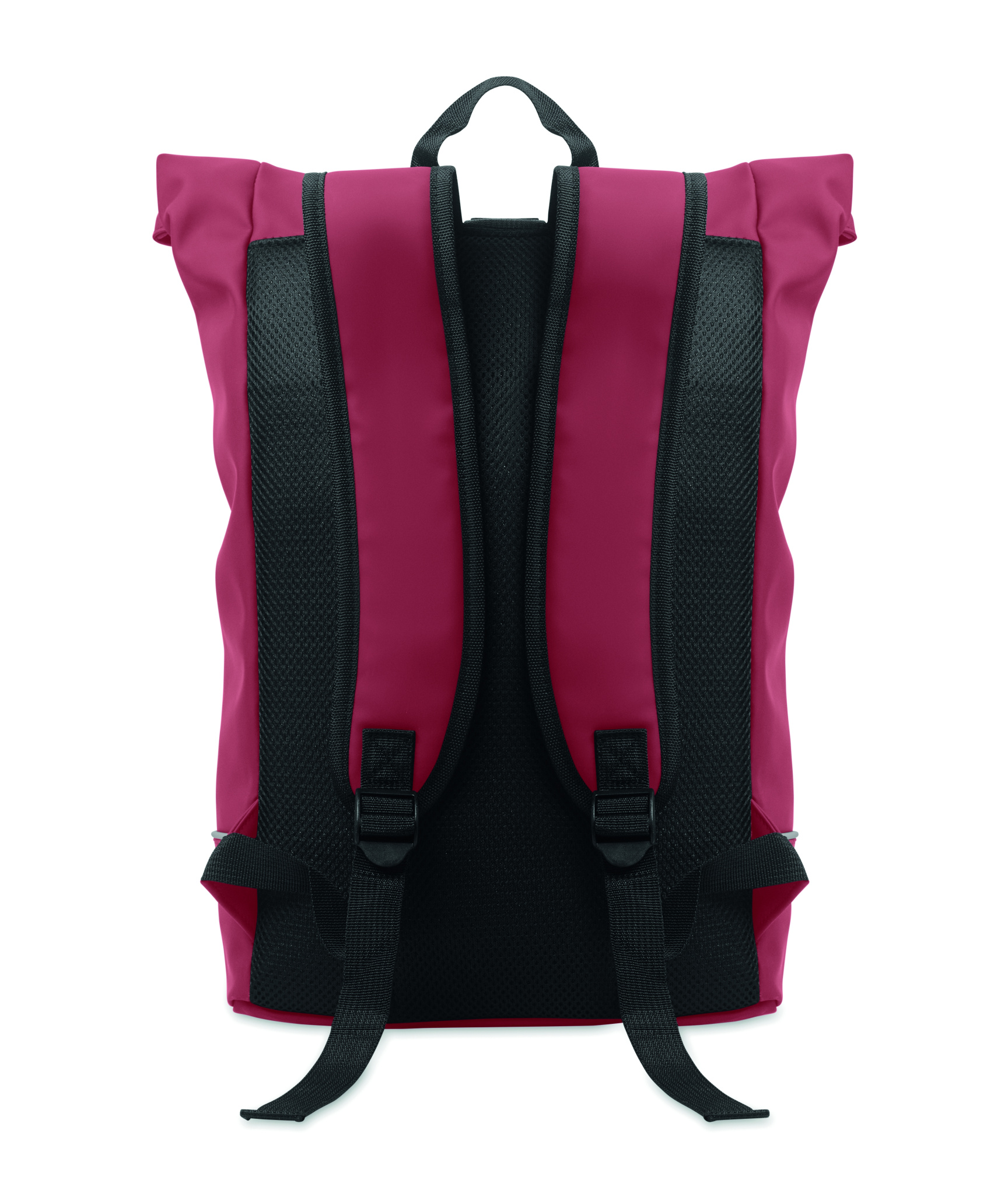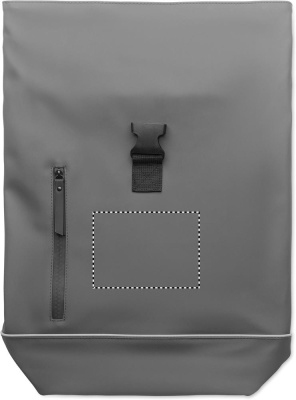 15 inch roll top laptop backpack in soft PU with padded back and base reinforcement with reflective strip. Waterproof zippered front pocket. 210D RPET polyester lining.