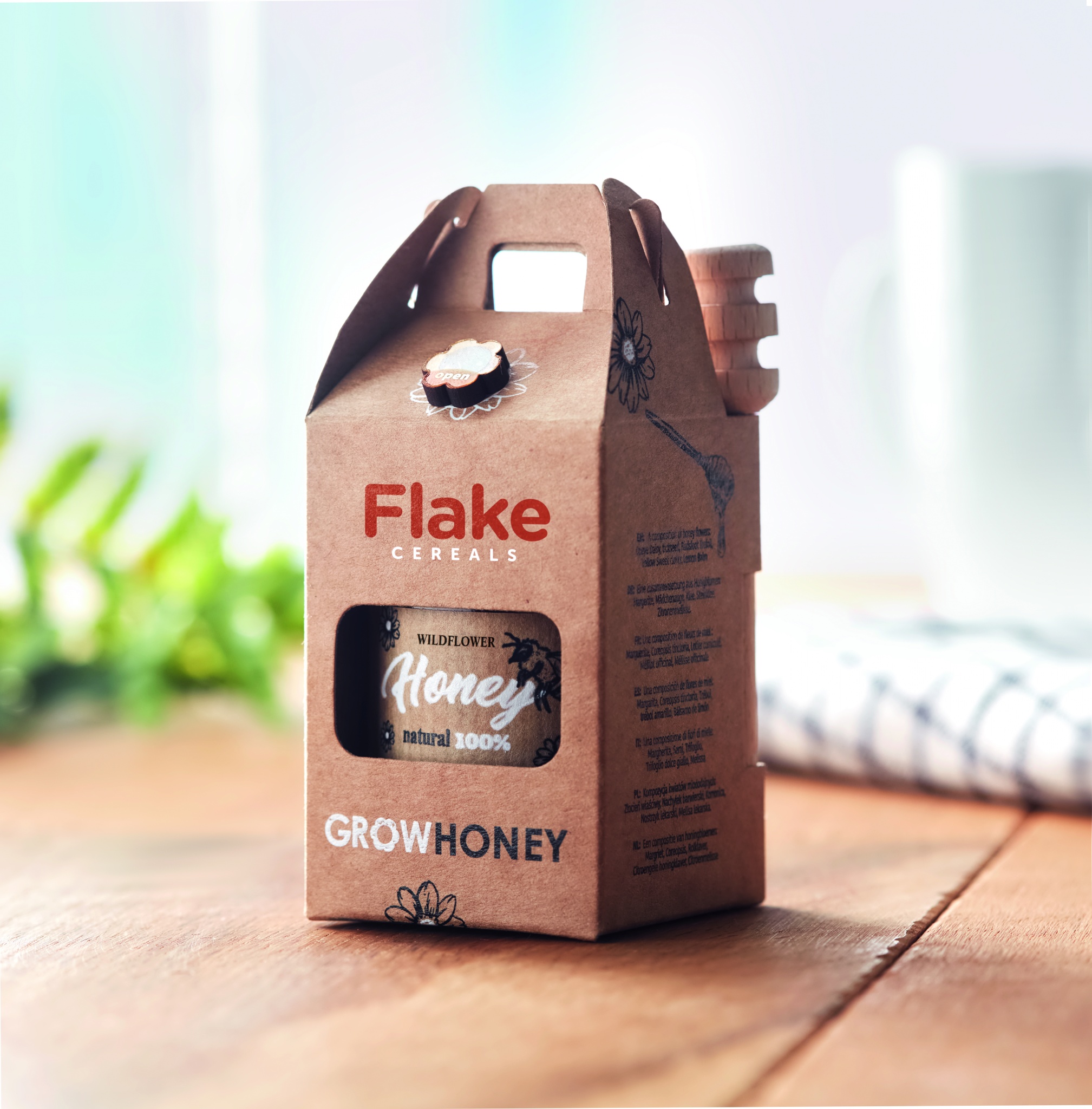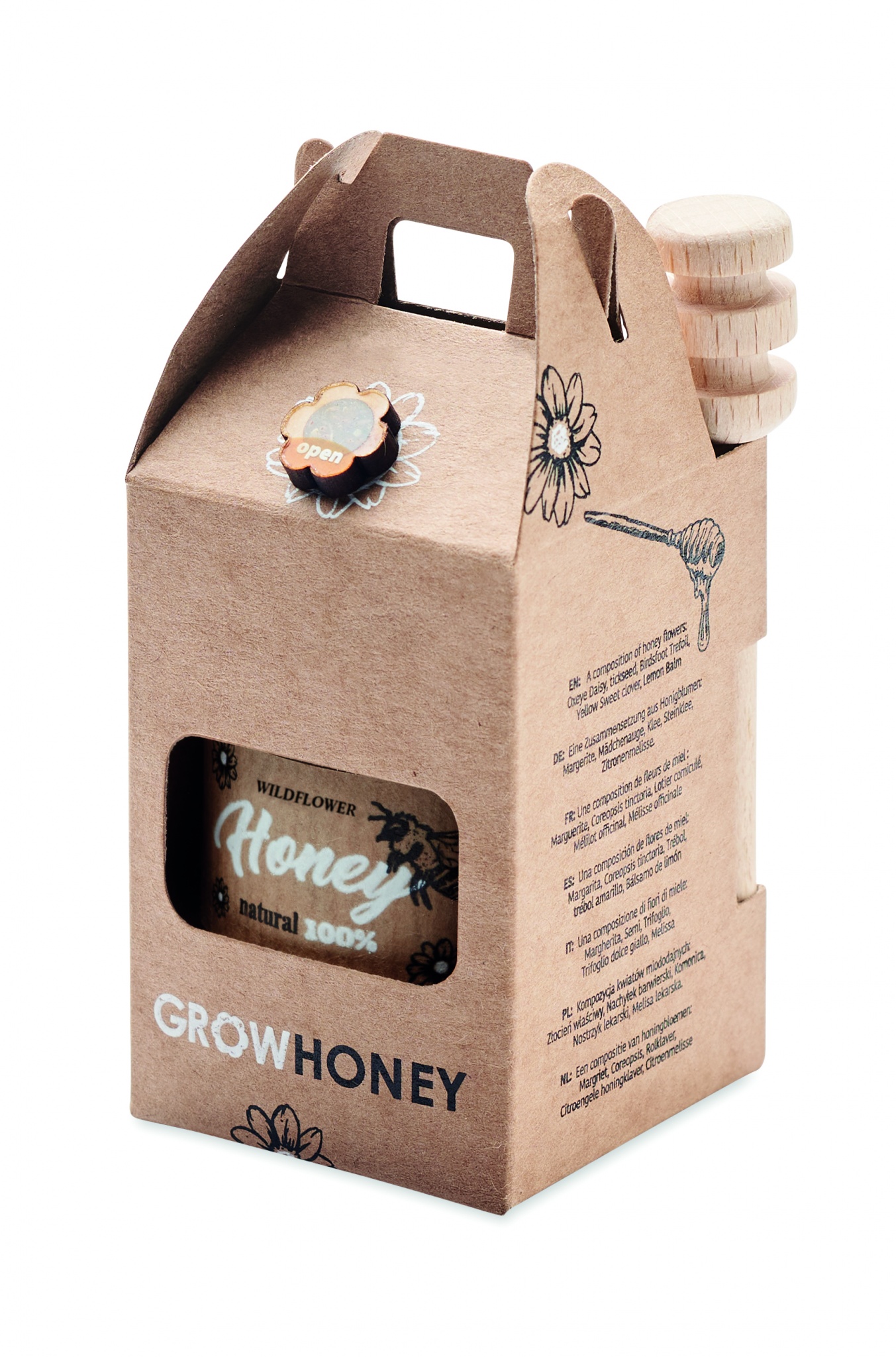 Мед из полевых цветов в банке (50 г) с деревянным ковшиком. Поставляется в коробке из крафт-бумаги. Сделано в ЕС.