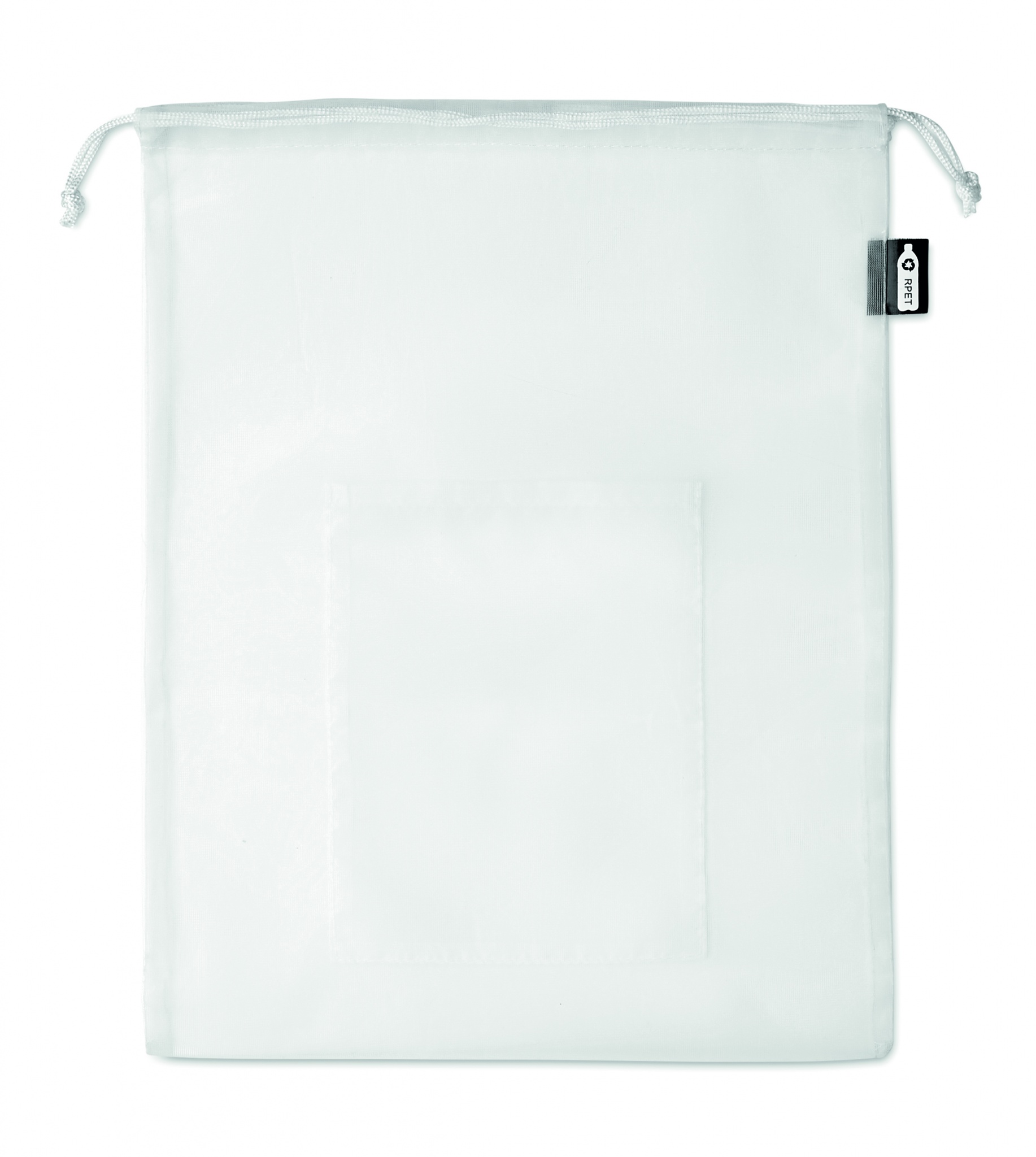 Сумка для продуктов сетчатая. С передним карманом и белым шнурком из полипропилена наверху. Печать на кармане.