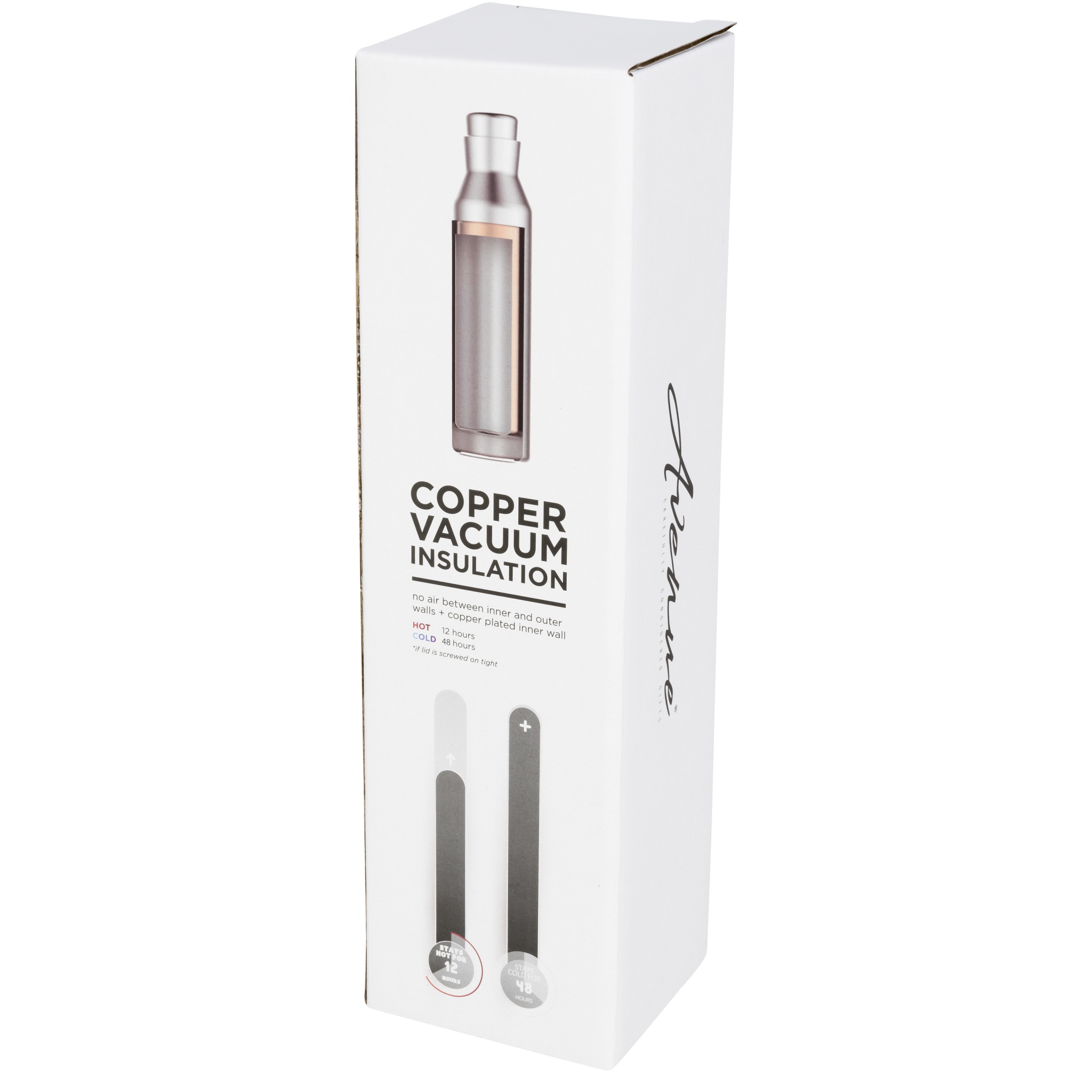 Прочная бутылка с двойными стенками из нержавеющей стали и вакуумной медной изоляцией сохраняет напитки горячими в течение 12 часов и холодными в течение 48 часов. Конструкция бутылки предотвращает образование конденсата на внешней стороне и включает герметичную крышку. Инновационная конструкция завинчивающейся крышки с пробкой. Подходит для большинства стандартных автомобильных держателей для чашек. Объем – 590 мл. Предлагается в подарочной коробке Avenue.