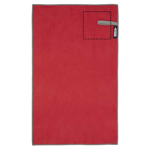 Спортивное полотенце Pieter очень хорошо впитывает влагу, легкое, быстро сохнет, а ткань прочная и очень мягкая. Когда полотенце сложено и закреплено резинкой, оно уменьшается до небольшого размера, поэтому его удобно брать с собой в тренажерный зал, бассейн, на пешую прогулку или в поход. Полотенце размером 50 х 30 см изготовлено из 90 % переработанного полиэстера GRS и 10 % нейлона. Его можно стирать в стиральной машине при температуре 40 °C. В комплект поставки входит мешок для хранения (15,5 x 10 см), изготовленный из переработанного ПЭТ-пластика, обеспечивающий большую площадь для печати логотипа.