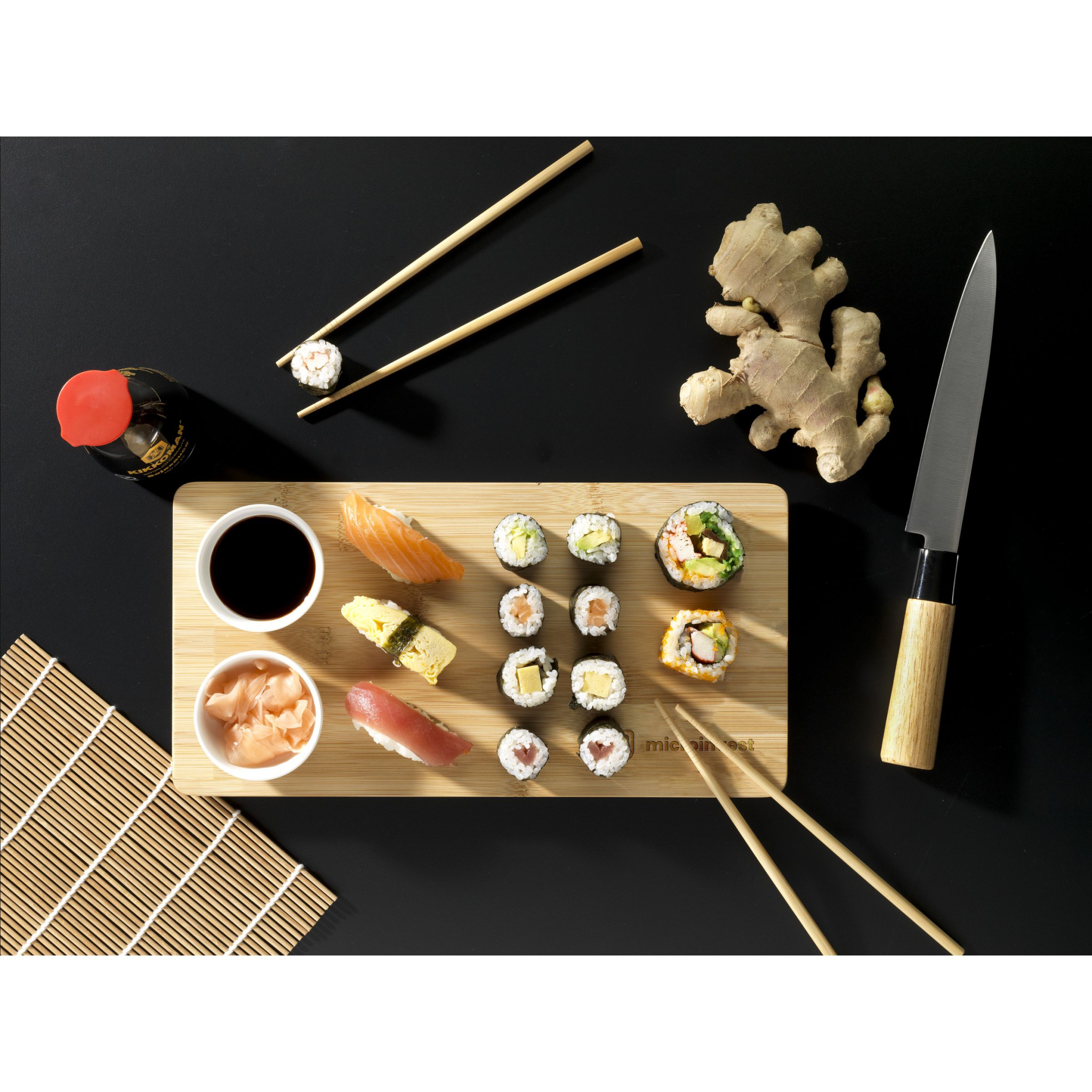 WoW! Полный набор для сервировки суши, состоящий из: бамбуковой доски для сервировки суши на ножках, 2 наборов бамбуковых палочек для еды и 2 керамических мисок (Ø 7 см). С этим набором вы сможете подавать суши стильно. Бамбук долговечен, гигиеничен, антибактериальен и легко моется. Предметы поставляются в наборе в коричневой картонной коробке.