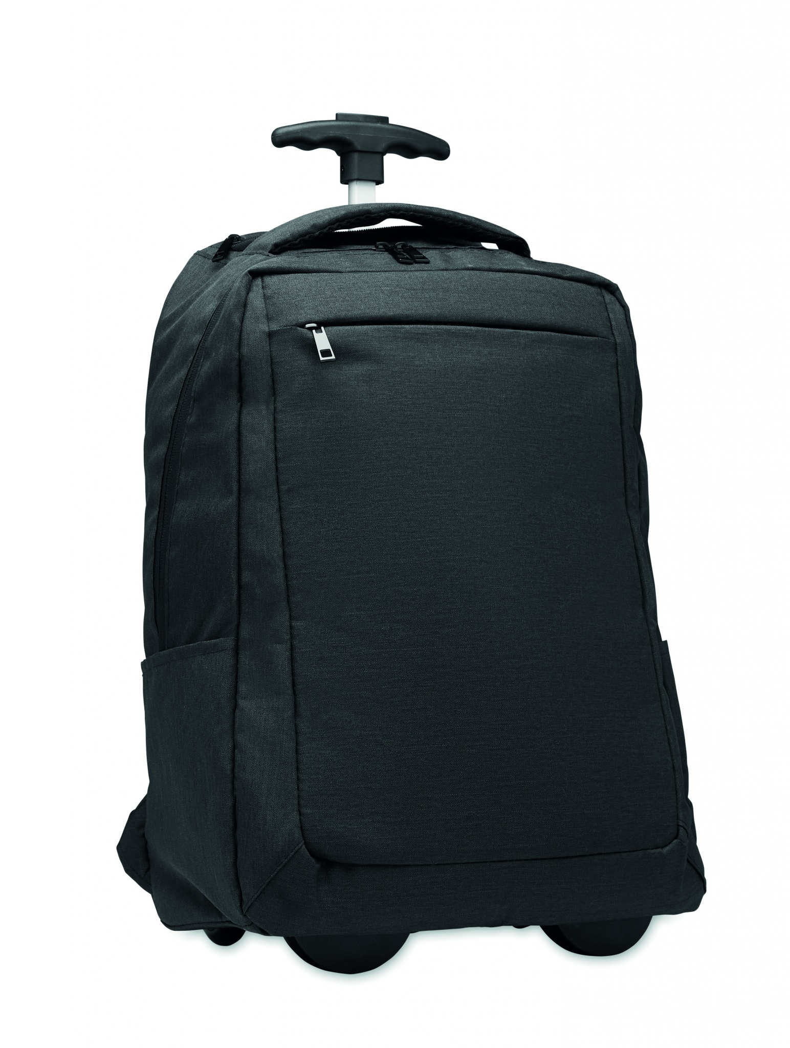 Рюкзак на колесах для ноутбука 15 дюймов из переработанного полиэстера 600D. Включает одно внутреннее отделение для 15-дюймового ноутбука. Передний карман на молнии. Два боковых накладных кармана. Три внутренних накладных кармана. Спинка и плечевые ремни с мягкой подкладкой. 2 колеса и двойная трубчатая рама.