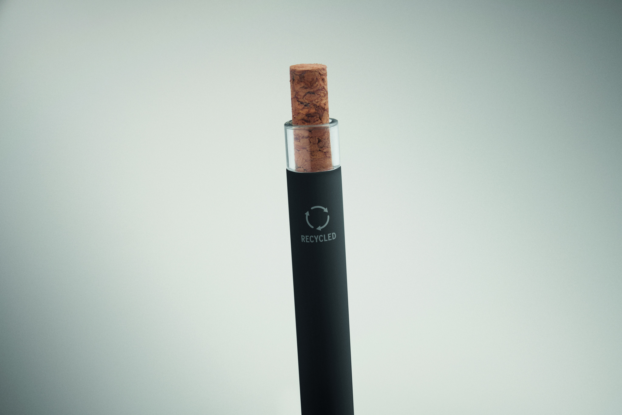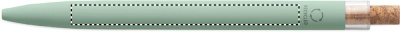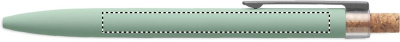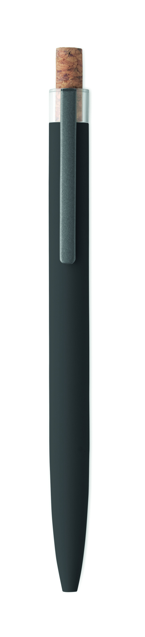 Push ball pen in recycled aluminium with cork detail button and metal clip. Blue ink.