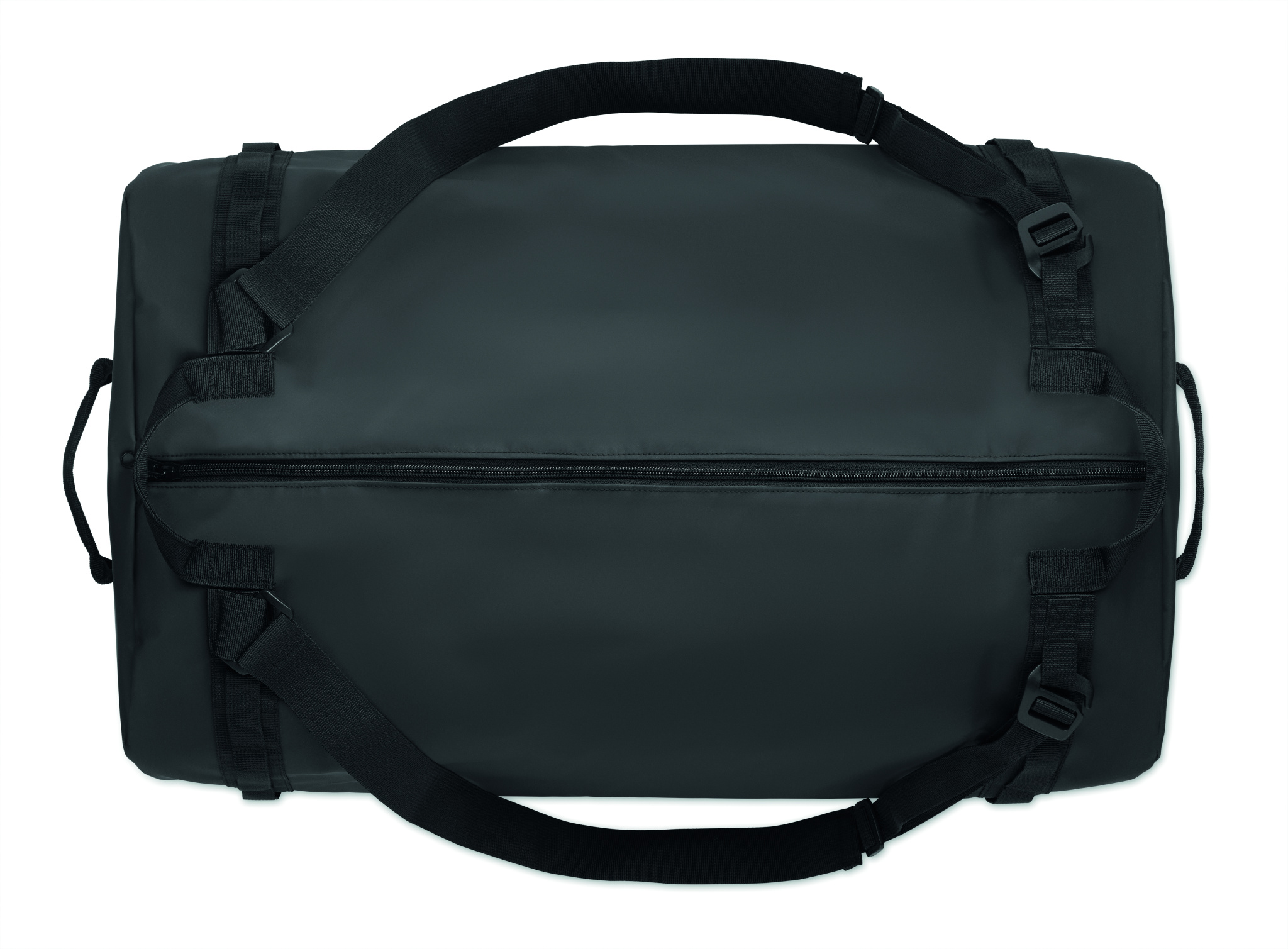 Large duffle bag, sports or travel bag which can also be used as a backpack in 50C tarpaulin with zippered inside compartment. It has a detachable and adjustable shoulder strap and has RPET lining.