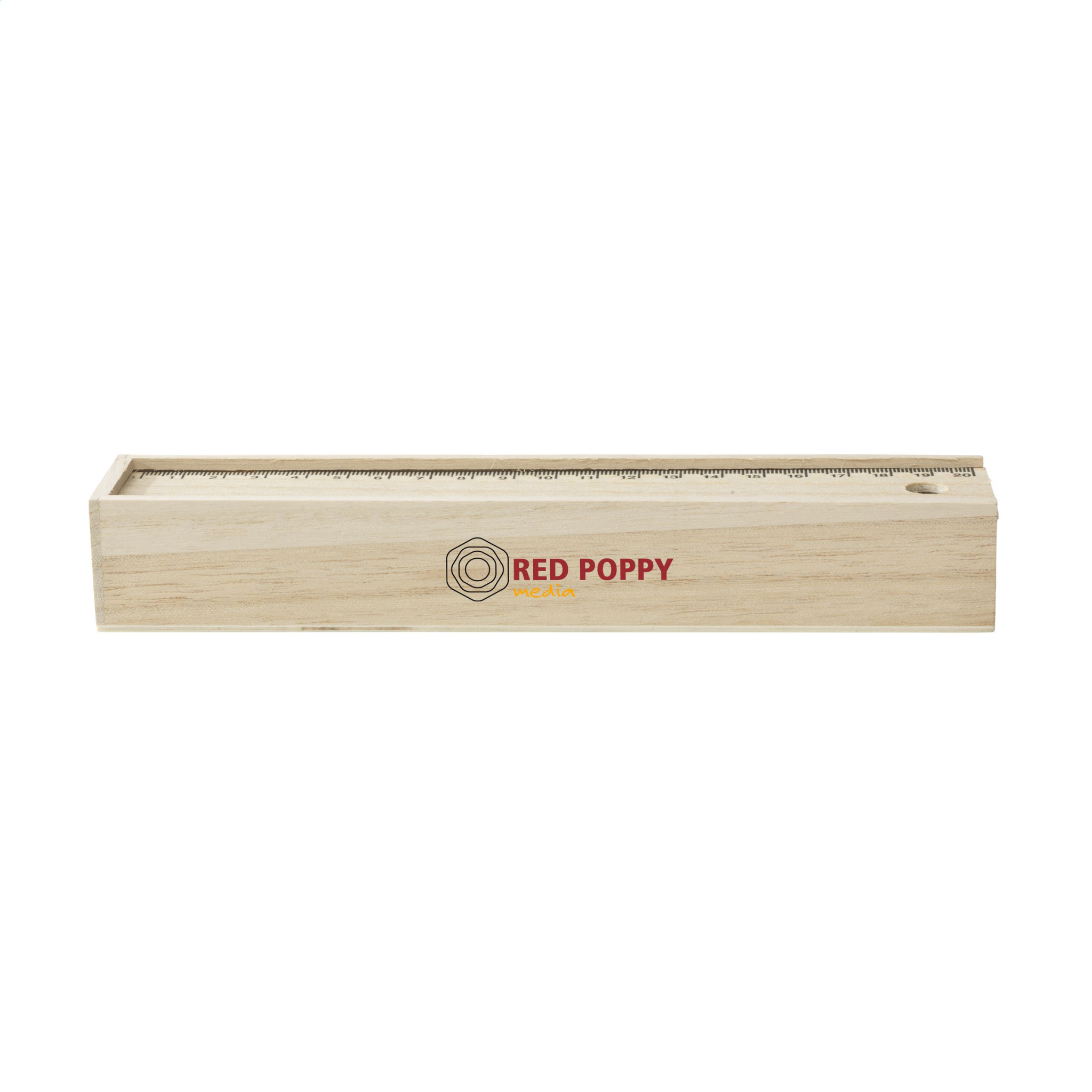 Деревянный ящик для хранения с выдвижной крышкой (линейка 20 см), 12 заточенных цветных карандашей и деревянная точилка.