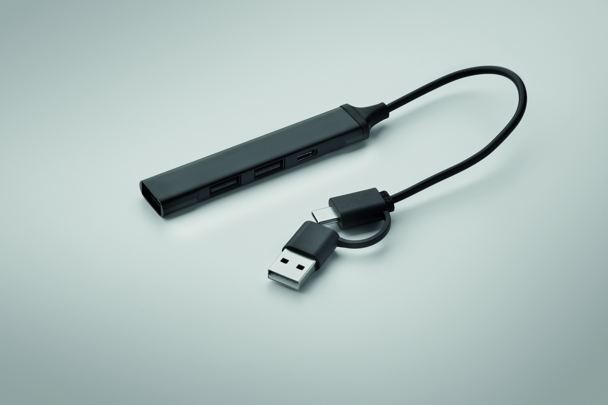 USB разветвитель на 4 порта из переработанного алюминия. 3 USB-A + 1 Type-C. Вход: 2-в-1 Type-C и Type-A. Длина кабеля: 19 см.