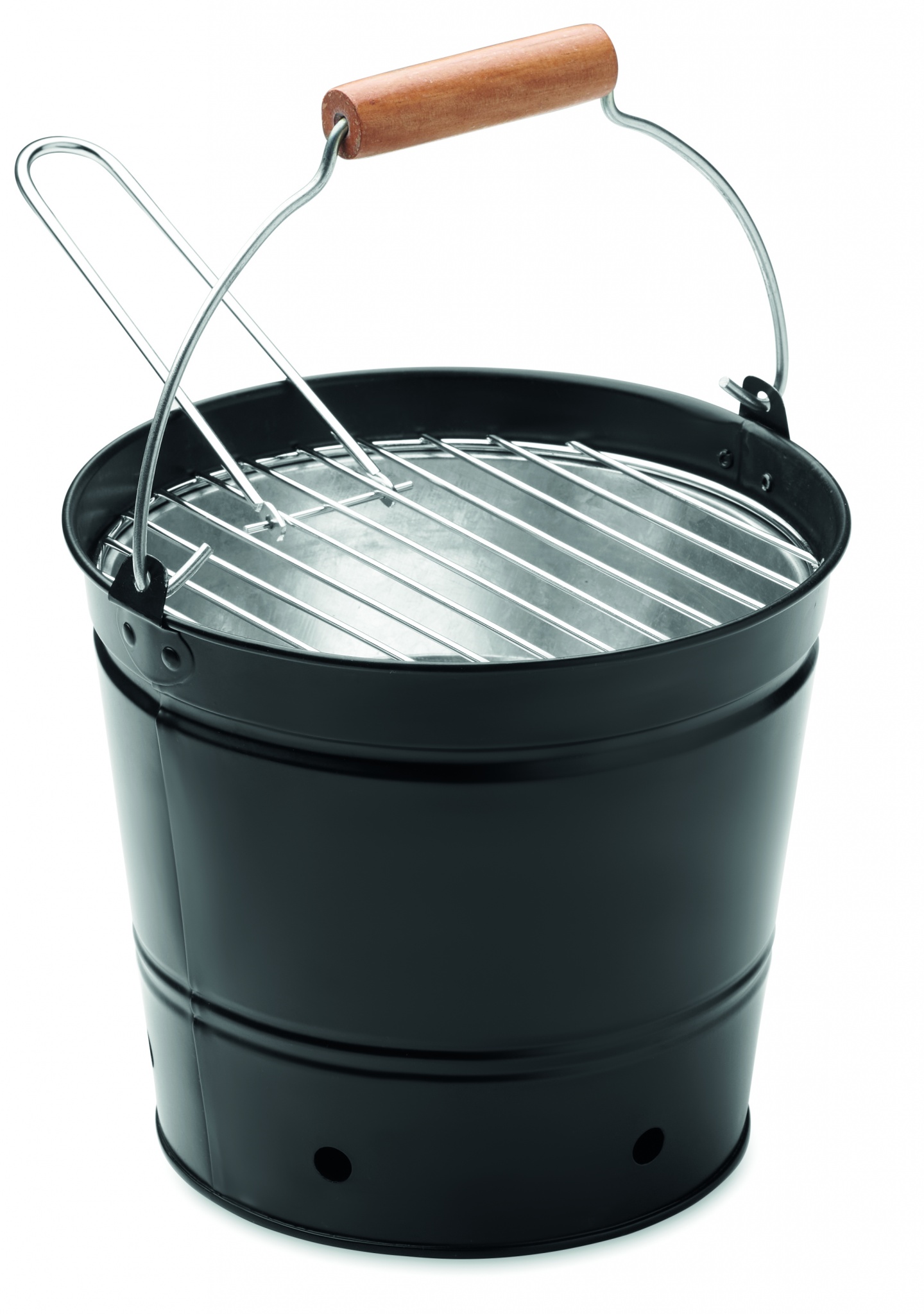Железное ведерко для барбекю с грилем из нержавеющей стали и деревянной ручкой.