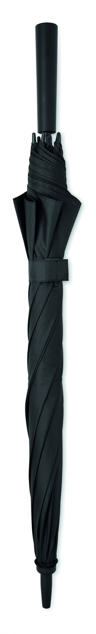 23-дюймовый ветроустойчивый зонт полуавтомат из эпонжа 190T с каркасом из стекловолокна, черным стержнем и пластиковыми наконечниками. Ручка из пластика с резиновым покрытием. Ручное закрытие