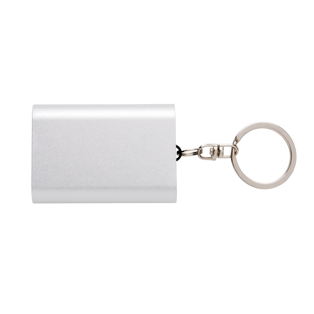 Nyckelring i aluminium med ett kompakt 1.000 mAh litiumbatteri att använda som backup. Kan ladda din telefon upp till 50%. USB porten med 5V/1A gör att den kan användas för alla mobila enheter. Output 5V/1A, input 5V/1A.