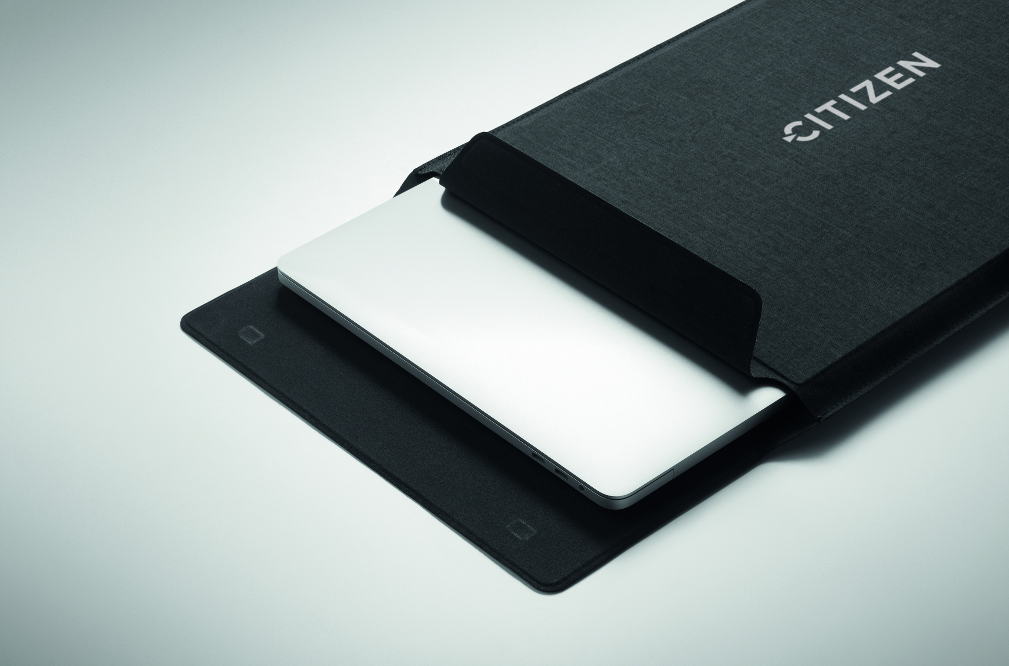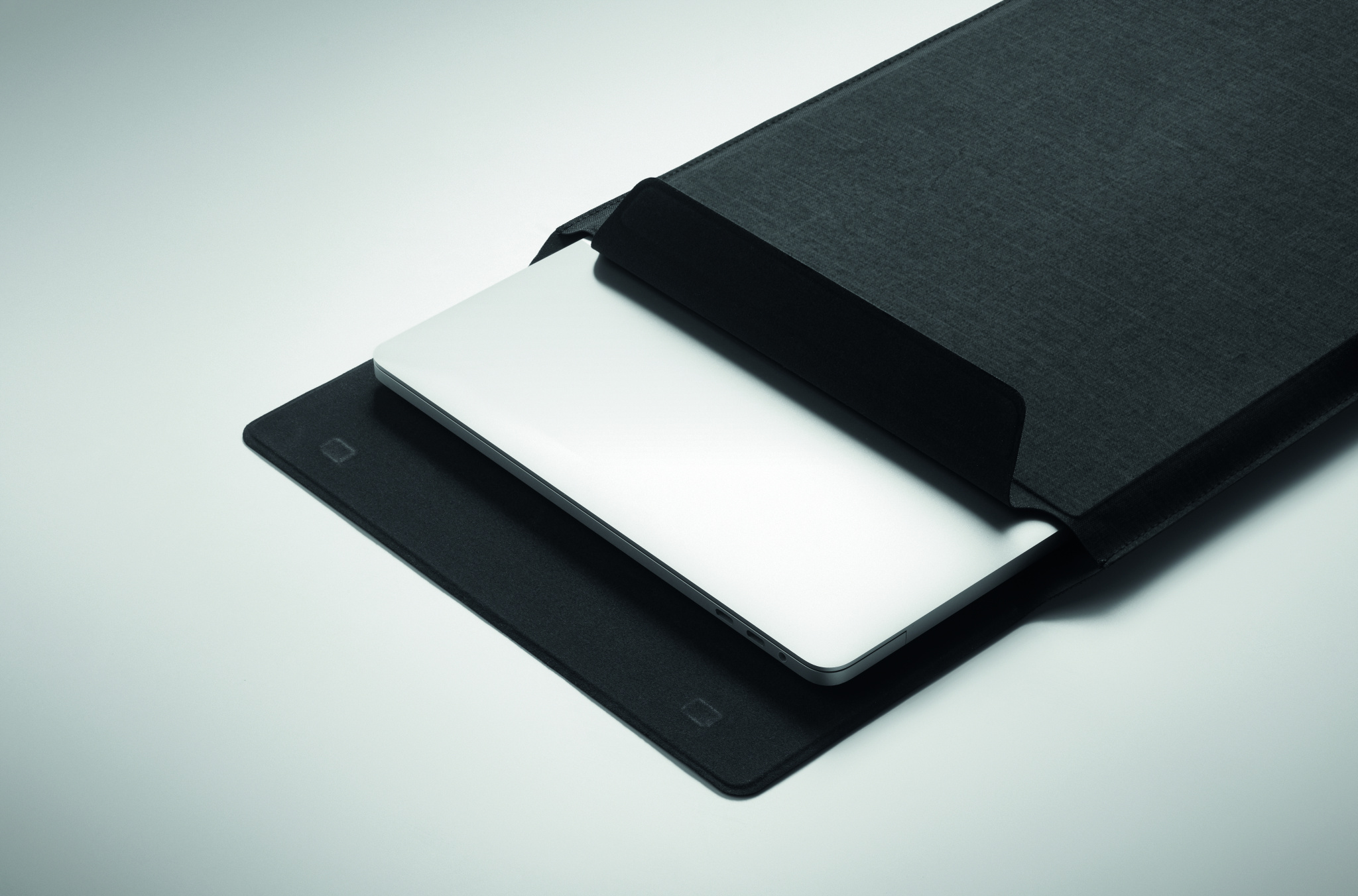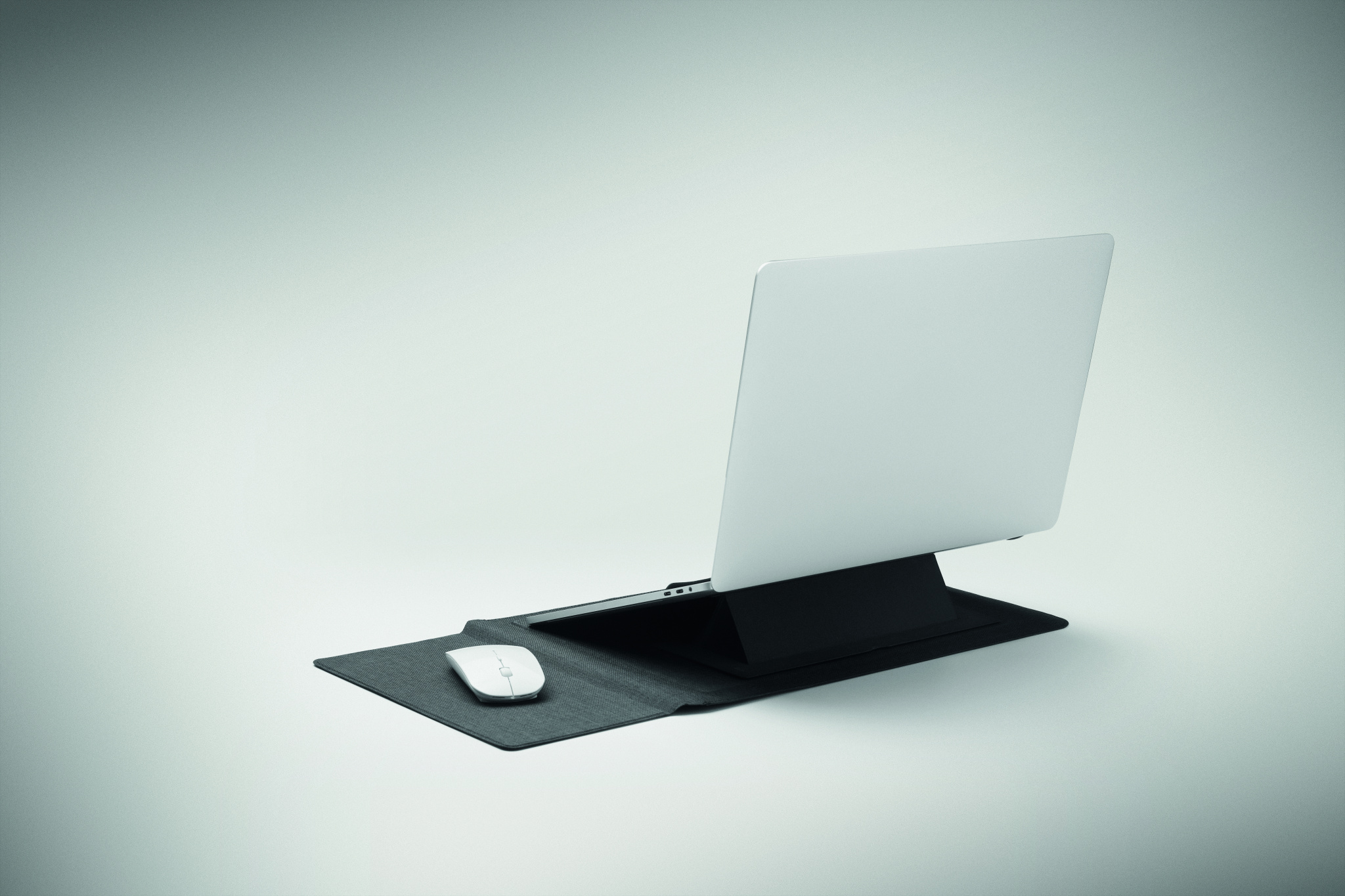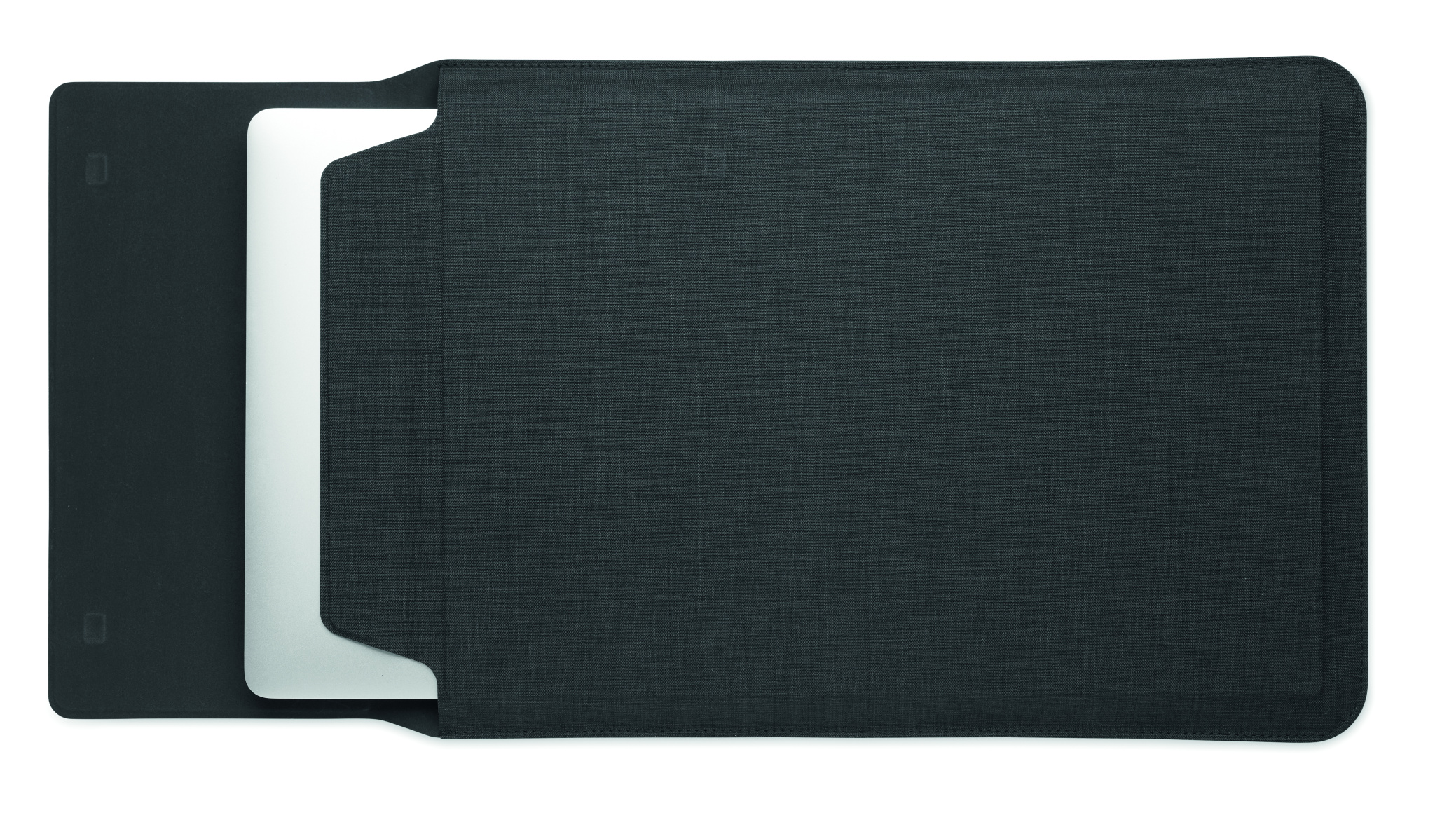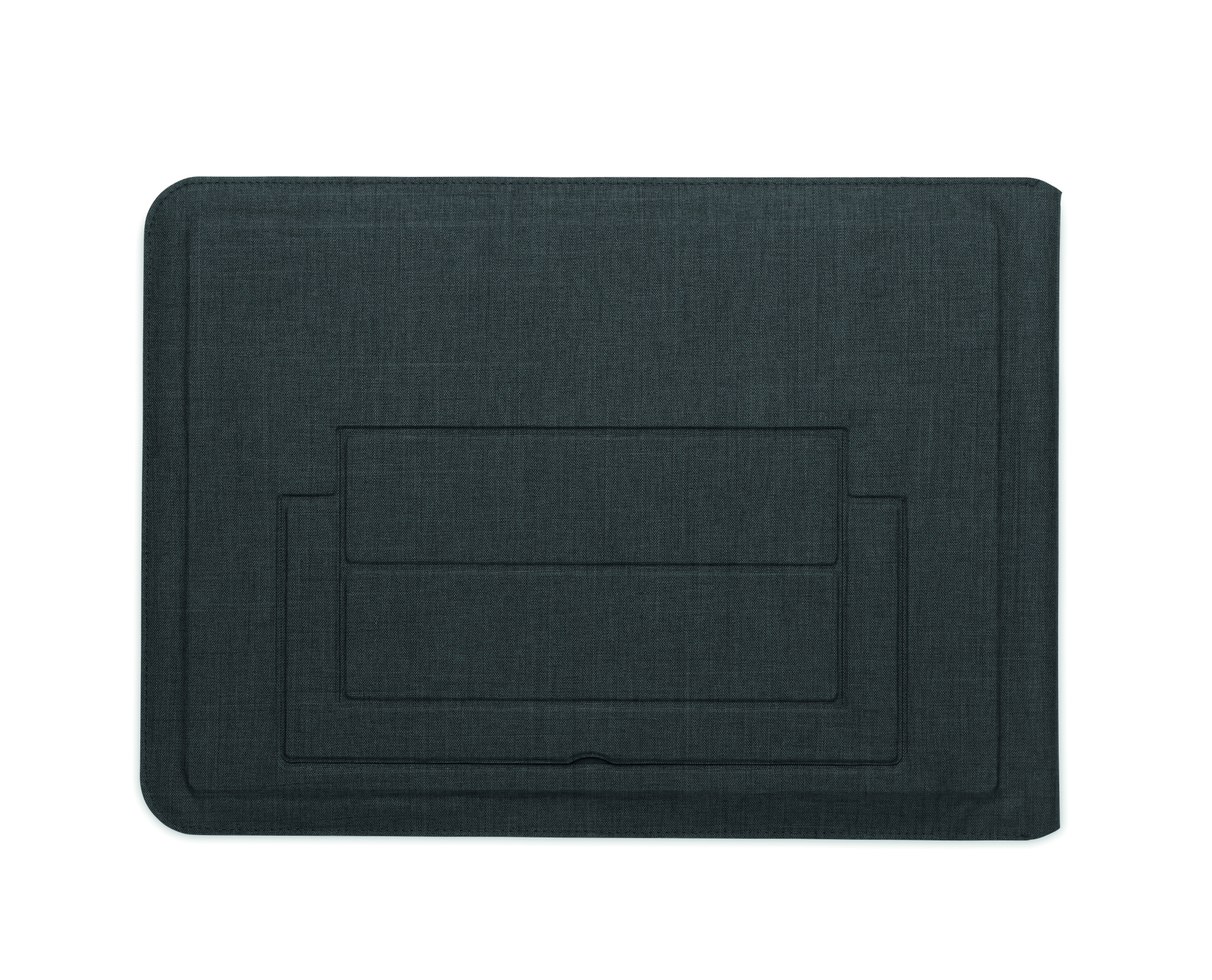 16 tums RPET-fodral för bärbar dator med stativ för bärbar dator och musmattefunktion när det är utfällt.