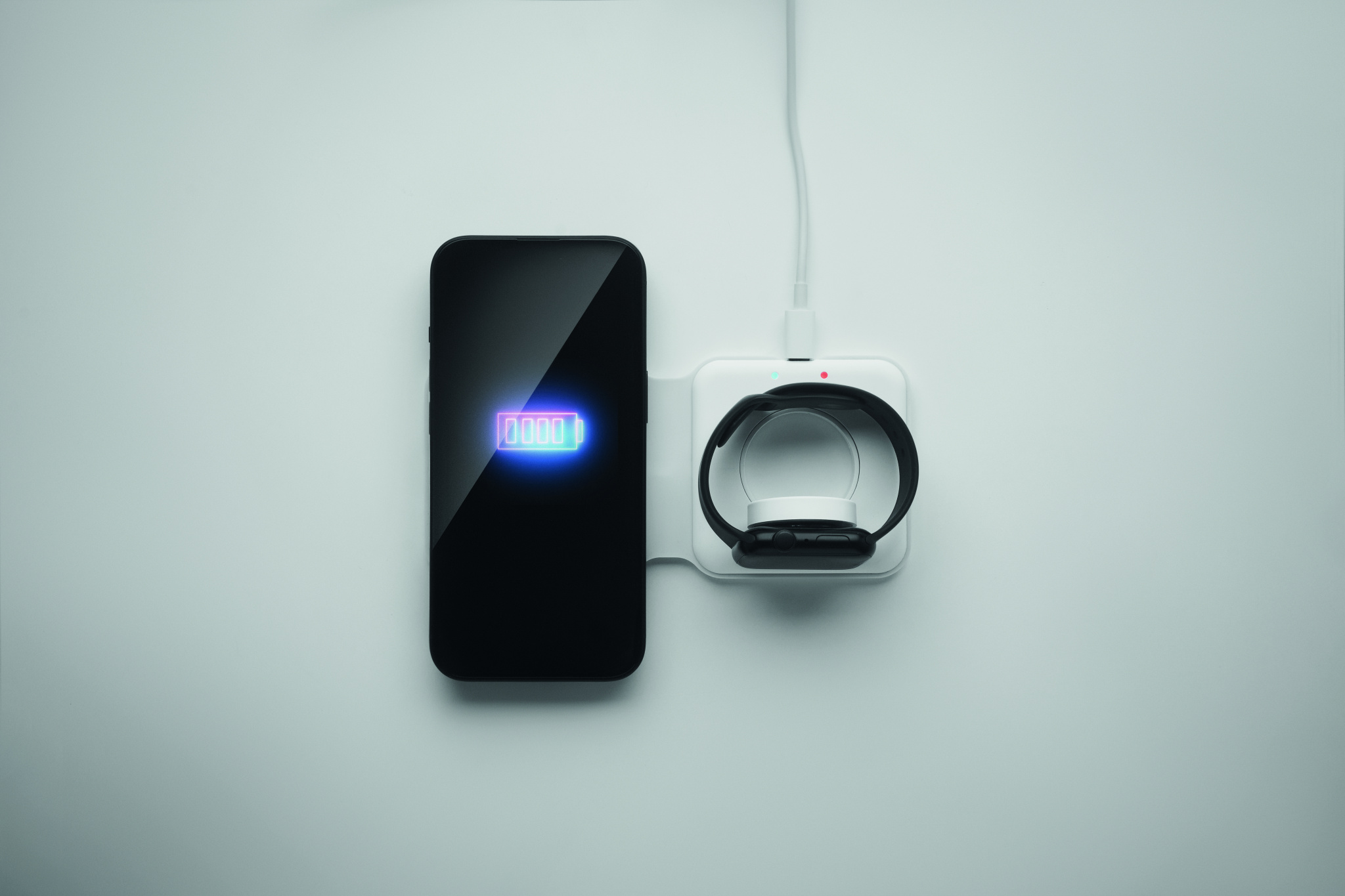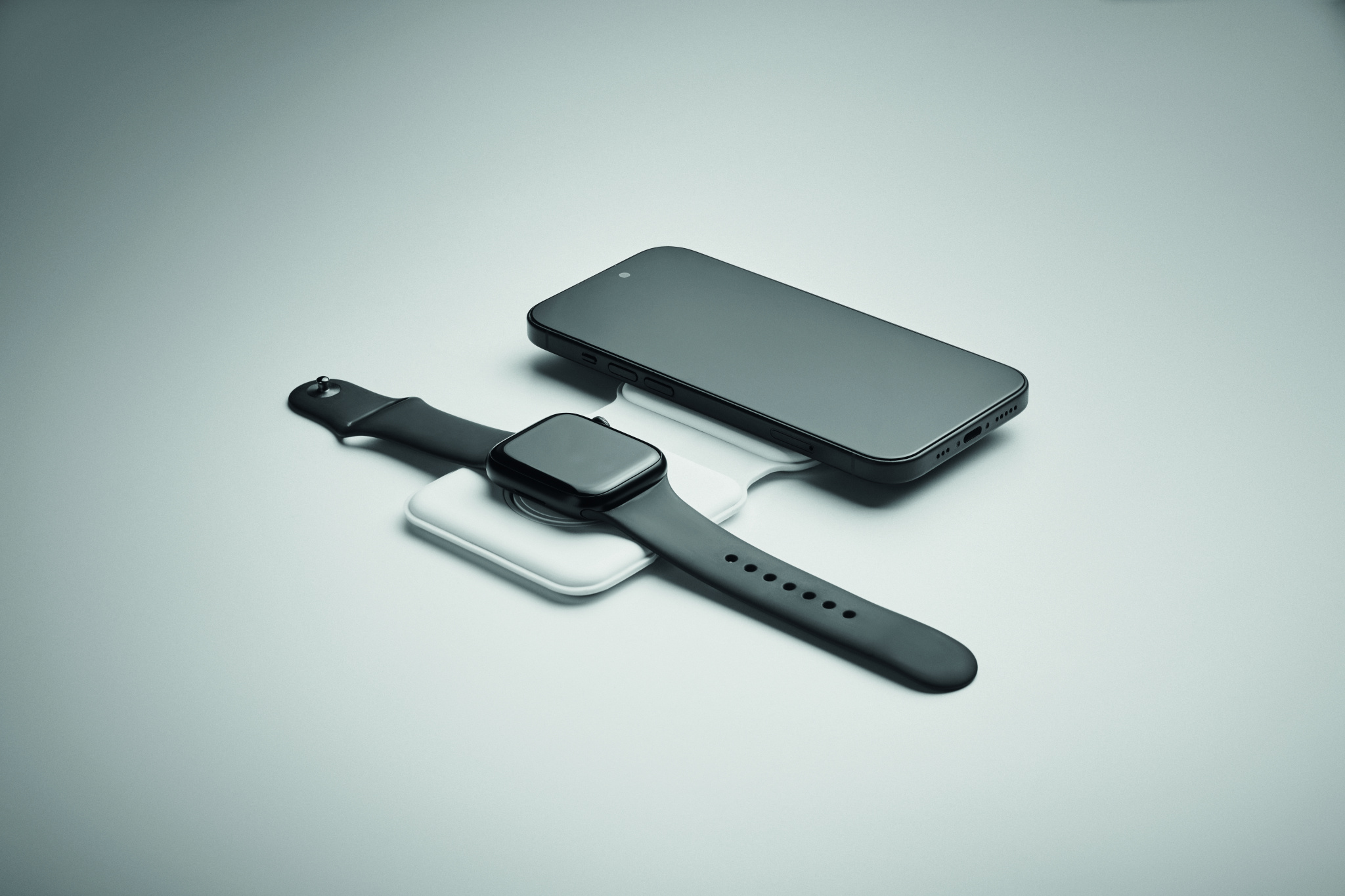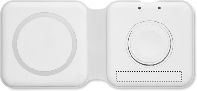 2 i 1 hopfällbar laddningsstation i ABS. Den innehåller en trådlös laddare på 15 W och en laddare för smartklockor (endast Apple®).
