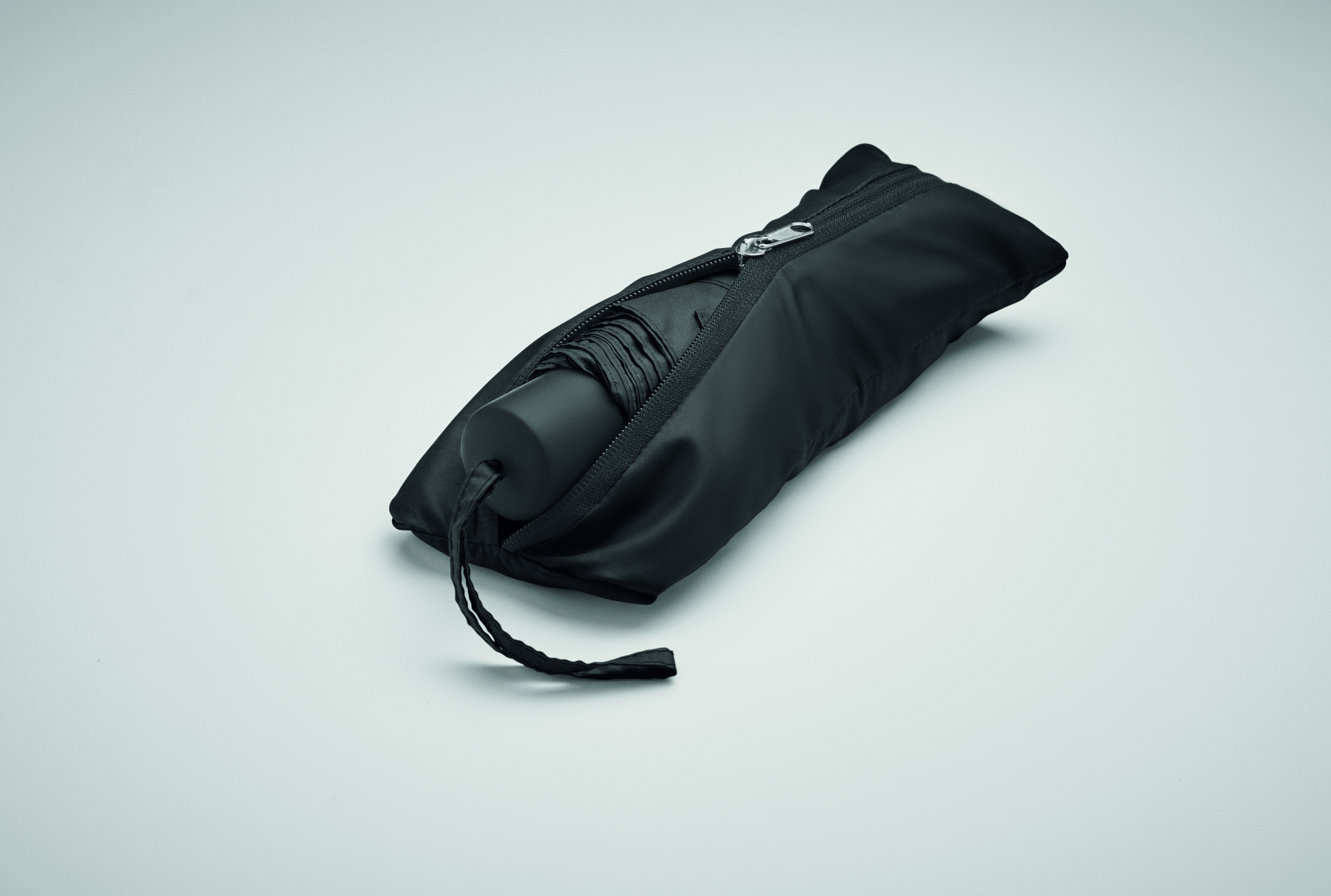 21 tum 3-delat paraply med manuellt öppnings- och stängningsbart, stormsäkert i 190T RPET pongee inklusive tygväska. Har ett dolt blixtlåsförsett fack för paraplyet och för att hålla väskans innehåll torrt. När väskan inte används rullas den ihop och blixtlåsfacket fungerar som paraplyfodral.