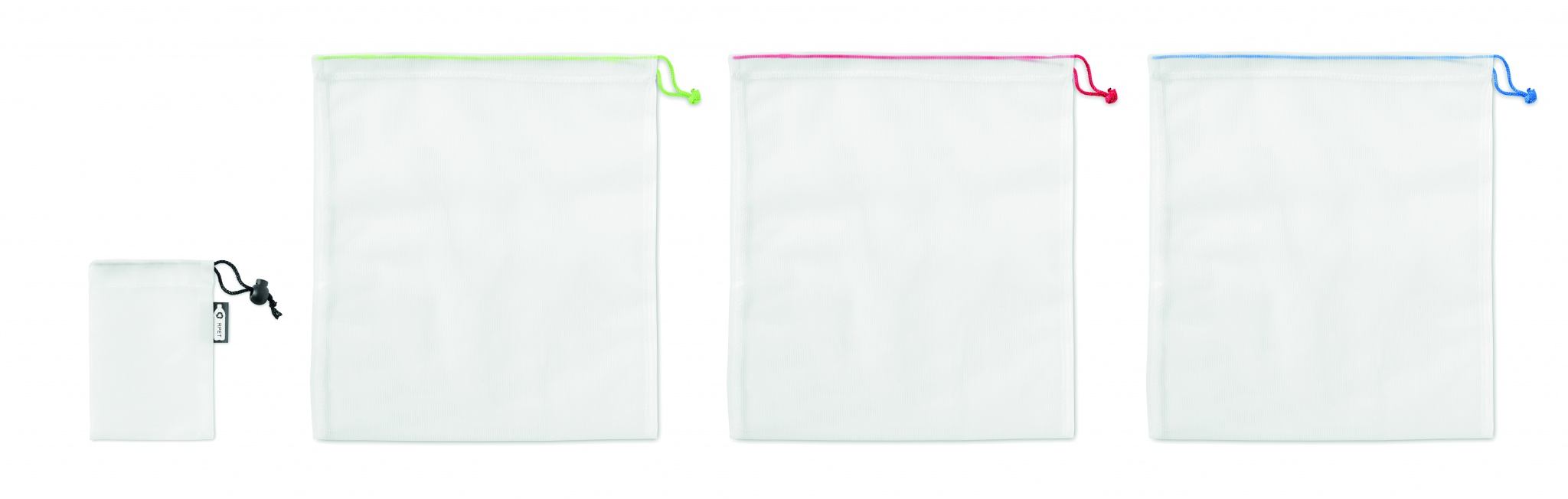 Set med 3 fruktpåsar i RPET. Dragsko
