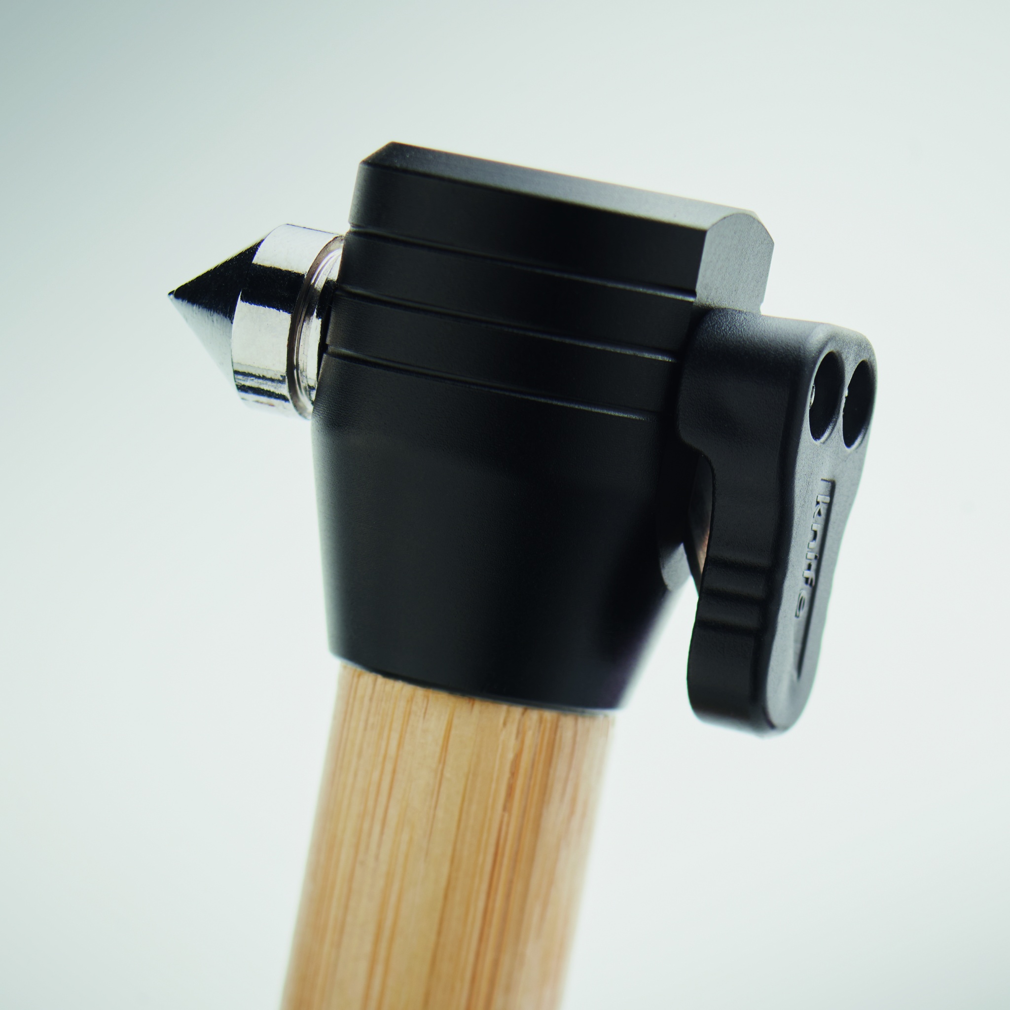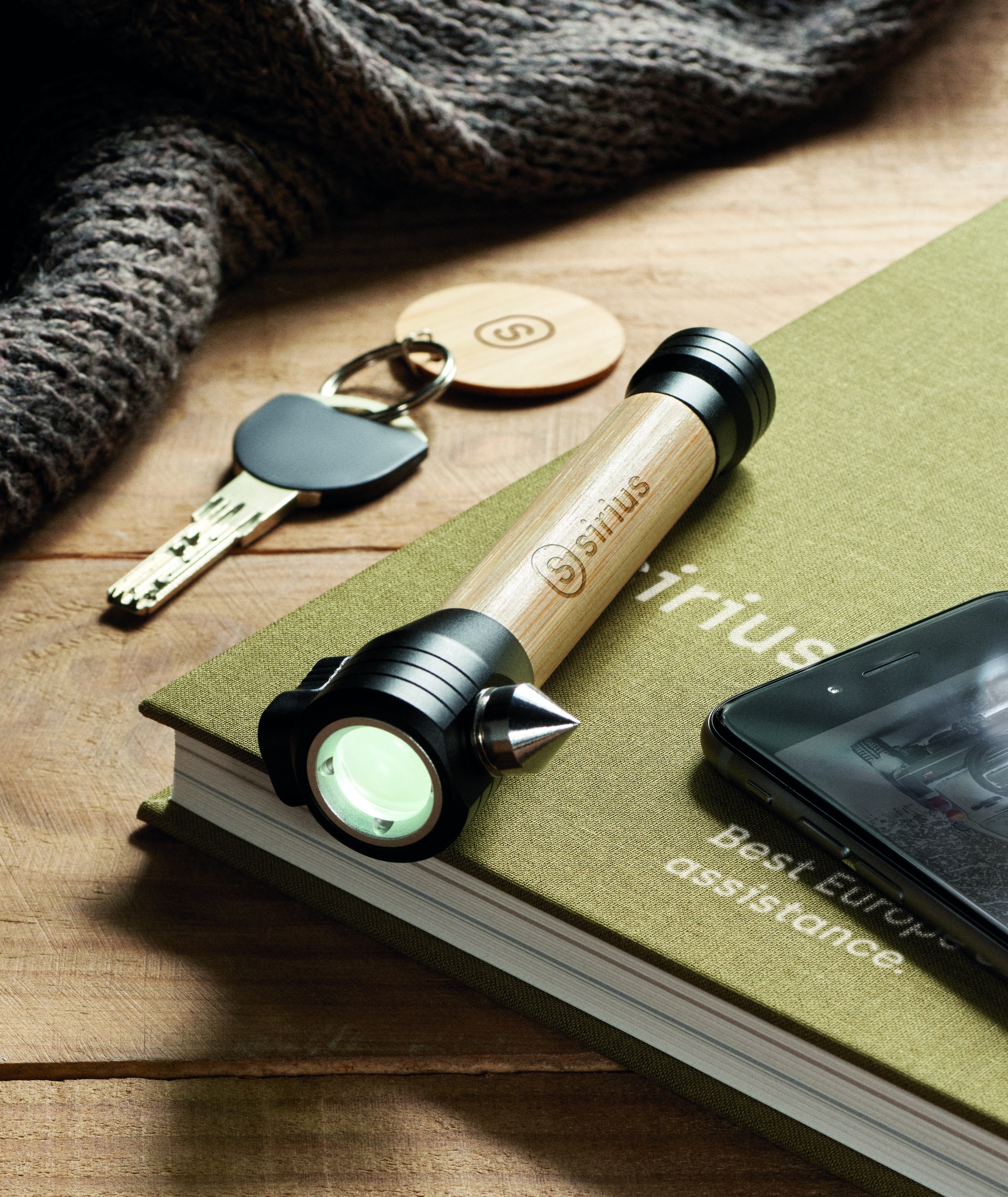 Logotrade kampanjprodukter bild: 3-i-1 bambuficklampa med nödhammare och säkerhetsbälteskniv