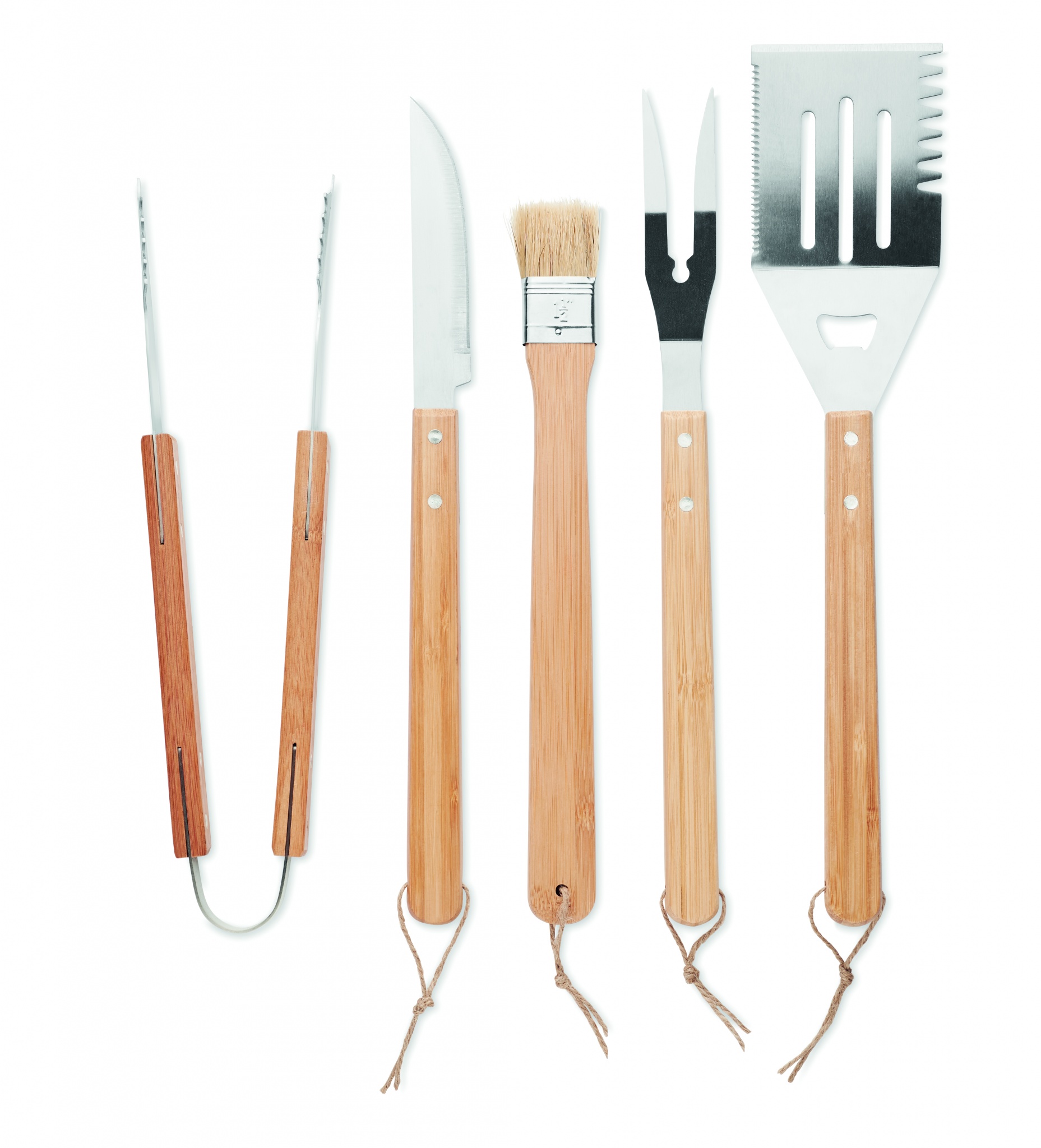 Set med 5-delars grillverktygssats i rostfritt stål med bambushandtag och påse i vaxad canvas. Innehåller spatel, kniv, tång, gaffel och grillpensel.