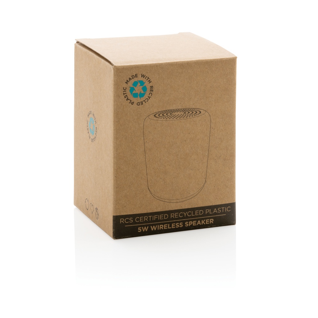 5W trådlös högtalare tillverkad av RCS (Recycled Claim Standard) certifierad återvunnen ABS och TPE. Totalt återvunnet innehåll: 38% baserat på total produktvikt. RCS certifiering säkerställer en helt certifierad leveranskedja av de återvunna materialen. Högtalaren har ett integrerat ljus i botten. Batteriet på 300 mAh ger en speltid på upp till 5 timmar, med BT5.0 för smidig anslutning och klart ljud, räckvidd upp till 10 meter. Med mikrofon för att besvara inkommande samtal. Laddningskabel i RCS certifierad TPE medföljer. Levereras i FSC® mix förpackning. Produkt och accessoarer är 100% PVC-fria.
