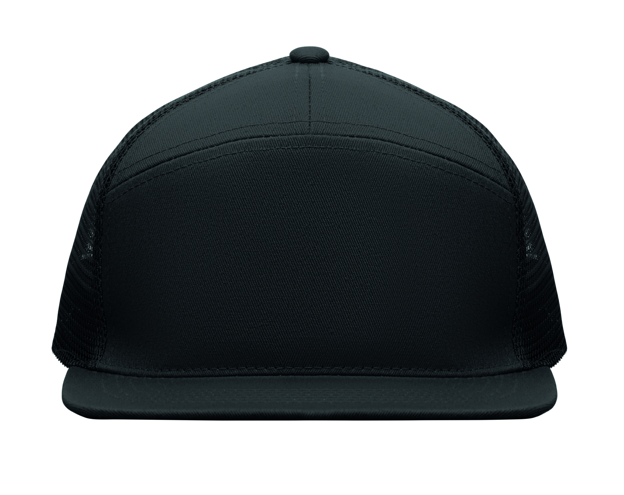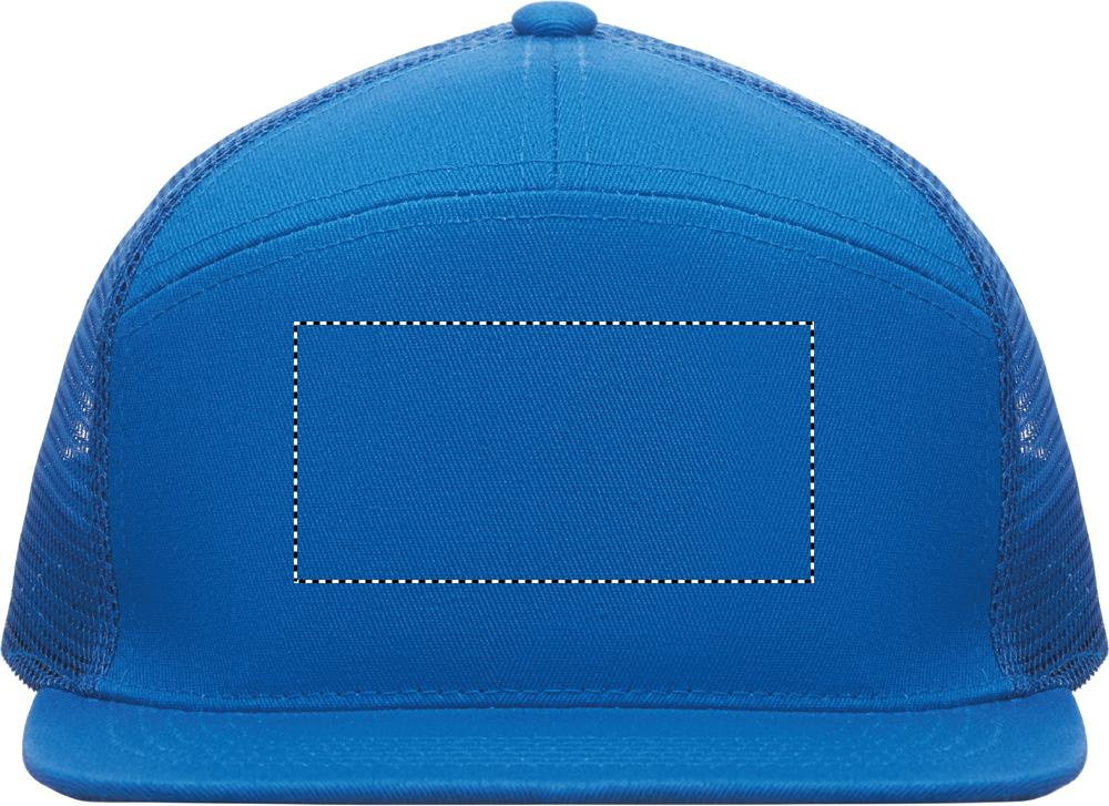 7 panelers keps i bomullstwill med baksida i polyestermesh och plastspänne. Platt skärm. 235gsm