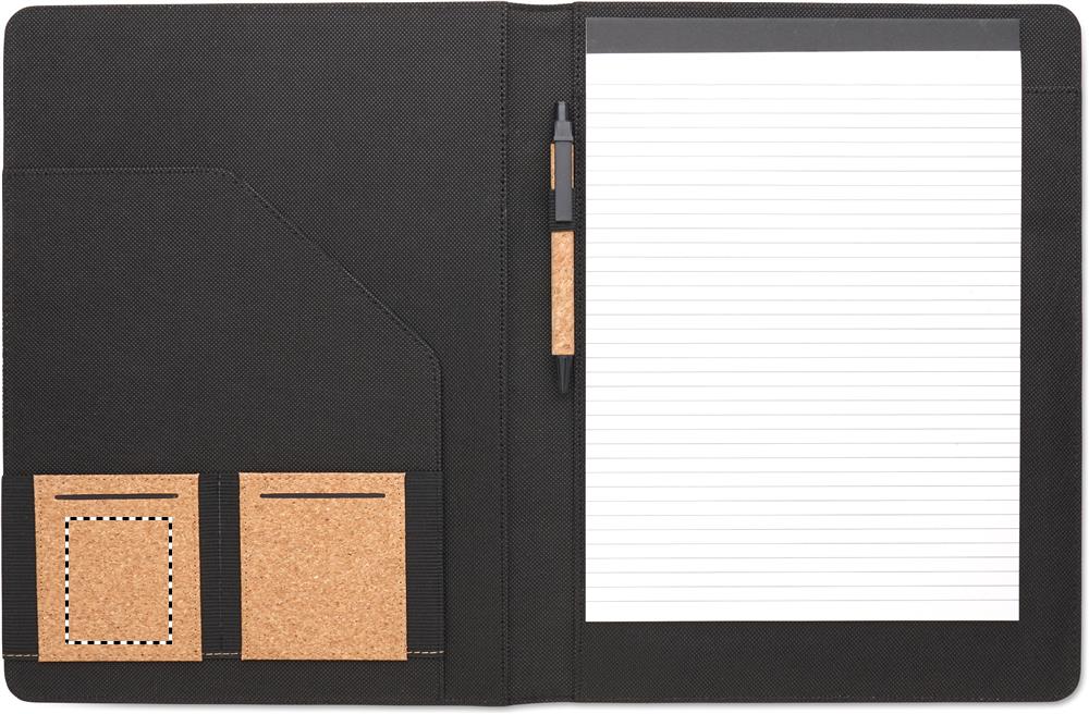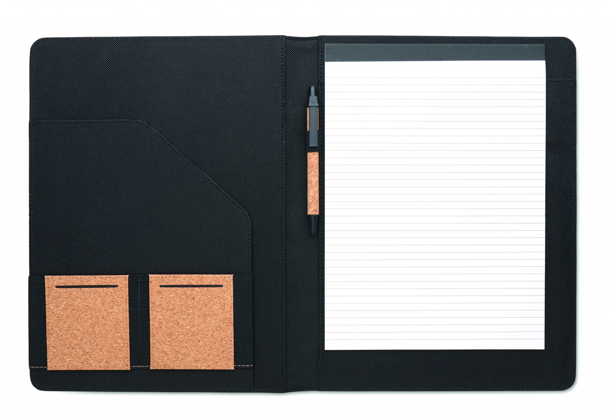 A4 konferensmapp i kork. Påfyllningsbart A4-anteckningsblock. 30 linjerade ark av återvunnet papper. Matchande penna och pennhållare. 2 korthållare och ett stort fack.