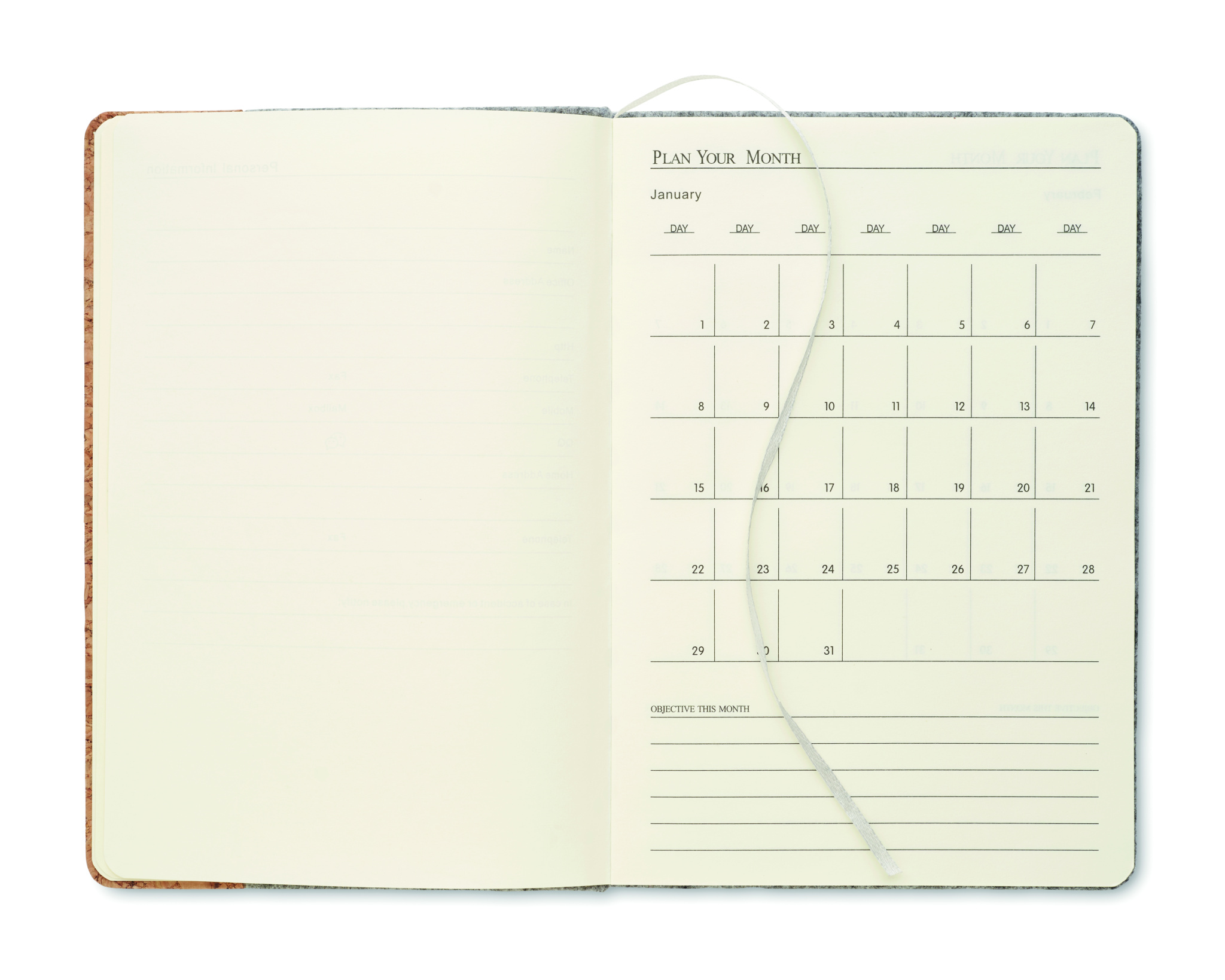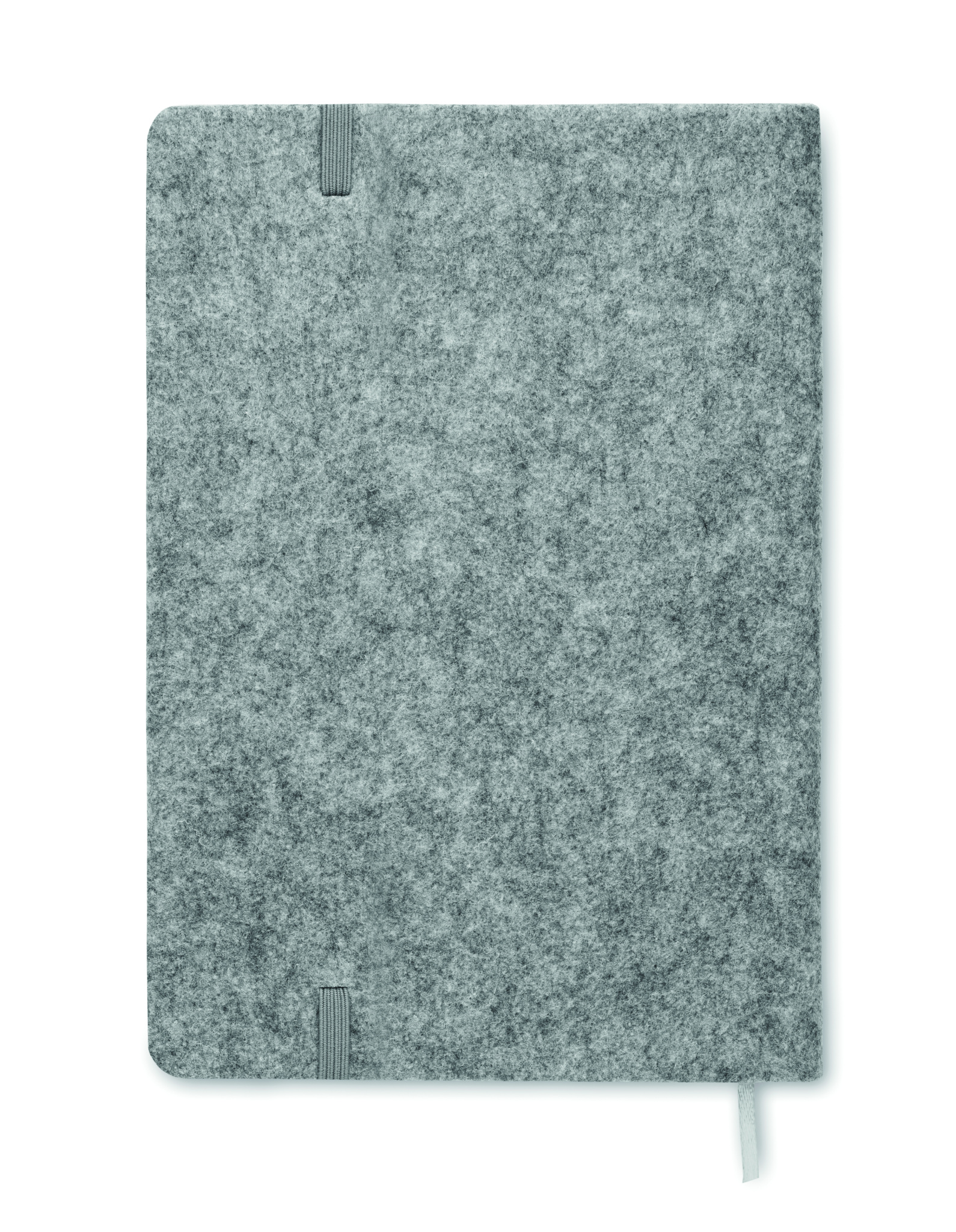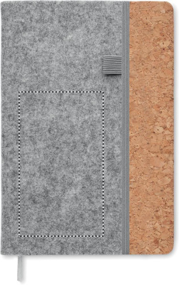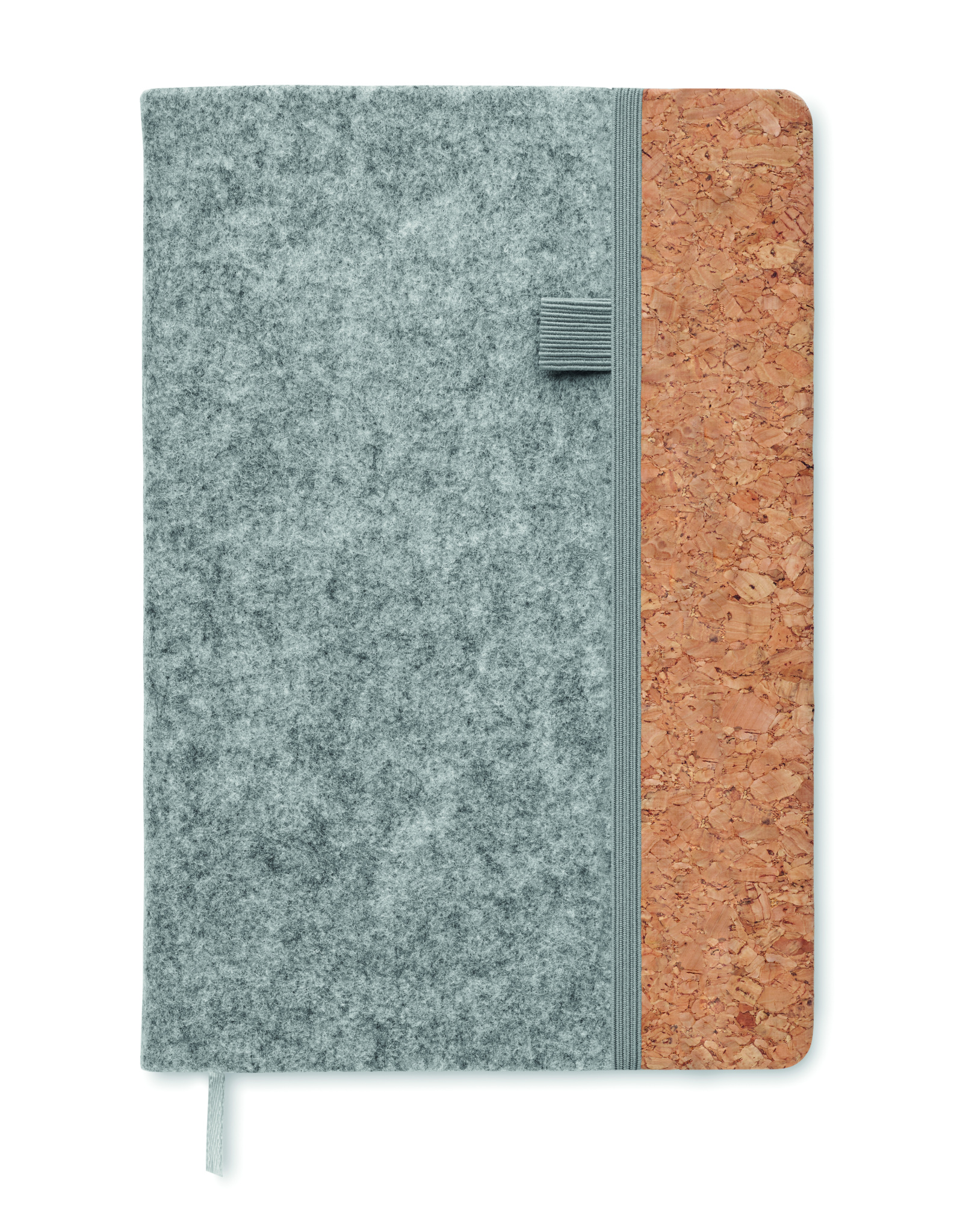 A5-anteckningsbok med omslag av RPET-filt och kork. 160 linjerade sidor av återvunnet papper (80 ark). Elastisk pennögla på framsidan, matchande elastiskt stängningsband och sidmarkör.