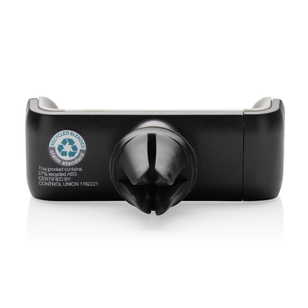 Universell och 360 graders roterbar mobilhållare för bil tillverkad av RCS (Recycled Claim Standard) certifierad återvunnet ABS. Totalt återvunnet innehåll: 37% baserat på total produktvikt. RCS-certifiering garanterar en helt certifierad leveranskedja för de återvunna materialen. Klicka enkelt fast hållaren på ditt ventilationsgaller och placera din mobiltelefon (upp till 6"). Tillverkad av värmebeständig återvunnen ABS och stark silikon för att undvika att den faller av ventilationsgallret under körning. Med mekanism i stainless steel på insidan för att säkerställa att din telefon stannar på plats.